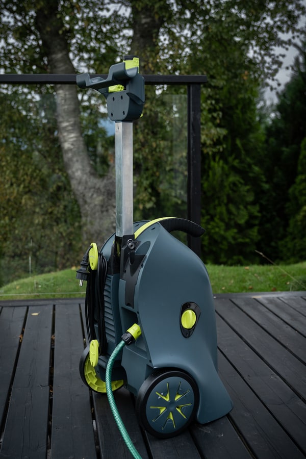 Högtryckstvätten är kompakt byggd med låg tyngdpunkt. Det betyder att den är stabil under användning. Rullen är placerad på sidan så att den är lätt att hantera för alla. Slangen rullas enkelt in med hjälp av handtaget på sidan.
