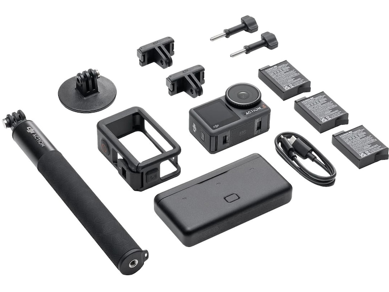 Inkluderade tillbehör 2 monteringsadaptrar, Skyddsram, USB-C till USB-C-kabel, Häftande bas, 2 st. linsskydd, 1,5 m förlängningsstång, Batterifack, 2 klistermärken, 2 skruvar