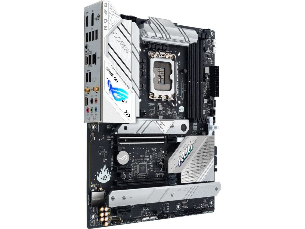 Diagonala lameller, borstad aluminium och djärv RGB har blivit kännetecken för ROG-estetiken, och Strix B760-A D4 bär dem alla med stolthet. Den vita, silverfärgade och svarta färgsättningen passar bra ihop med både mörka och ljusare komponenter. 8-bitars accenter visar viss spelstolthet.