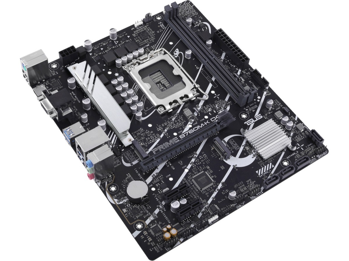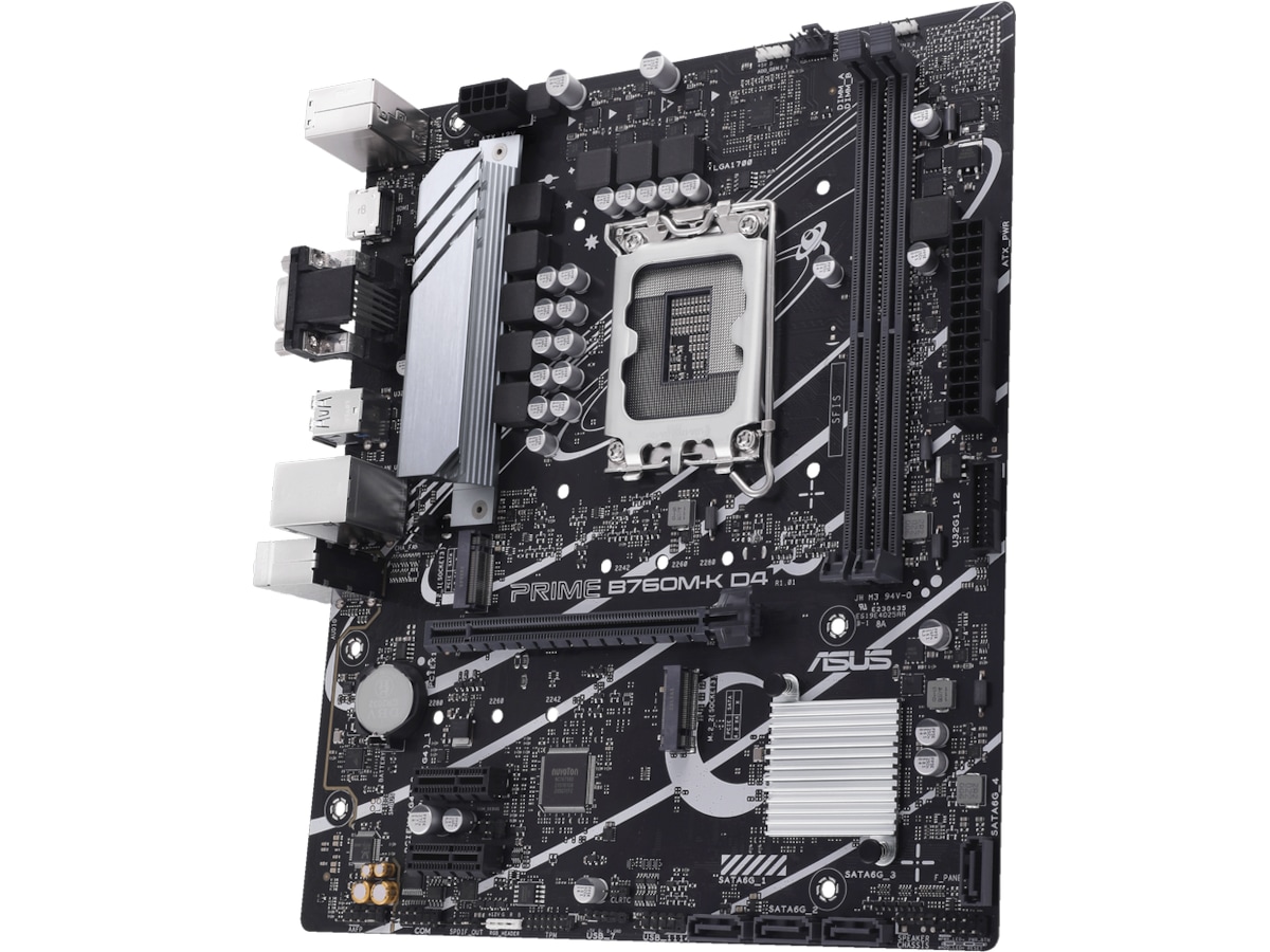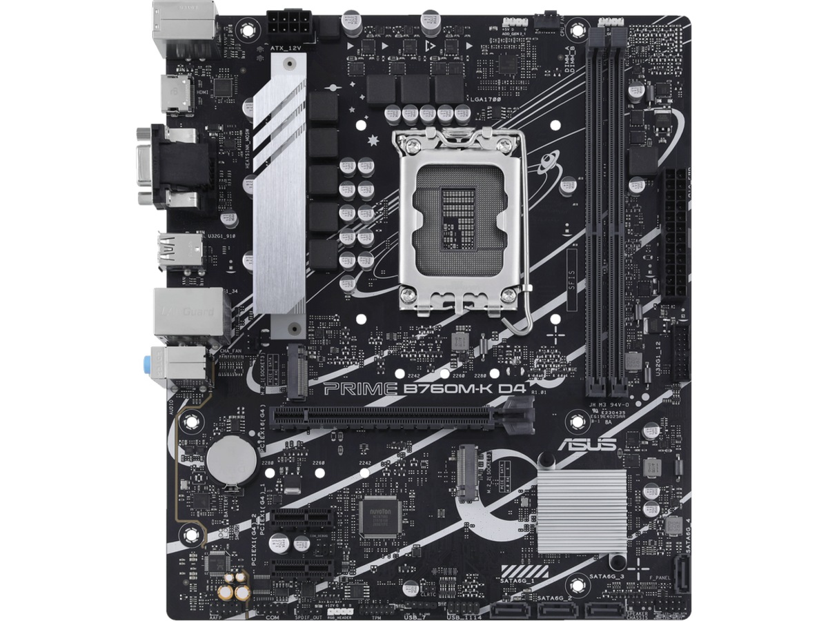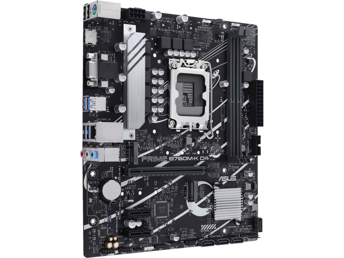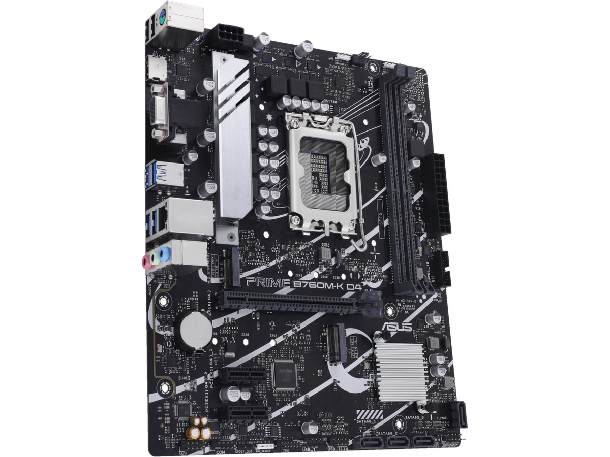 ASUS Prime B760M-K D4, ett Intel® B760 LGA 1700 mATX-moderkort med PCIe 4.0, två PCIe 4.0 M.2-platser, DDR4, Realtek 2,5 Gb Ethernet, VGA, HDMI®, SATA 6 Gbps, USB 3.2 Gen 1 på framsidan, Aura Sync