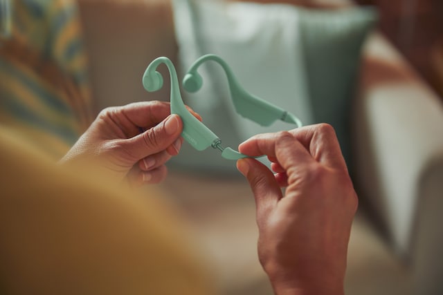 De här hörlurarna använder bone conductionteknik för att låta barnen höra sin musik, sina lektioner eller sina spel. På så sätt kan hörlurarna vila framför öronen så att barnet kan höra allt som händer runt omkring.