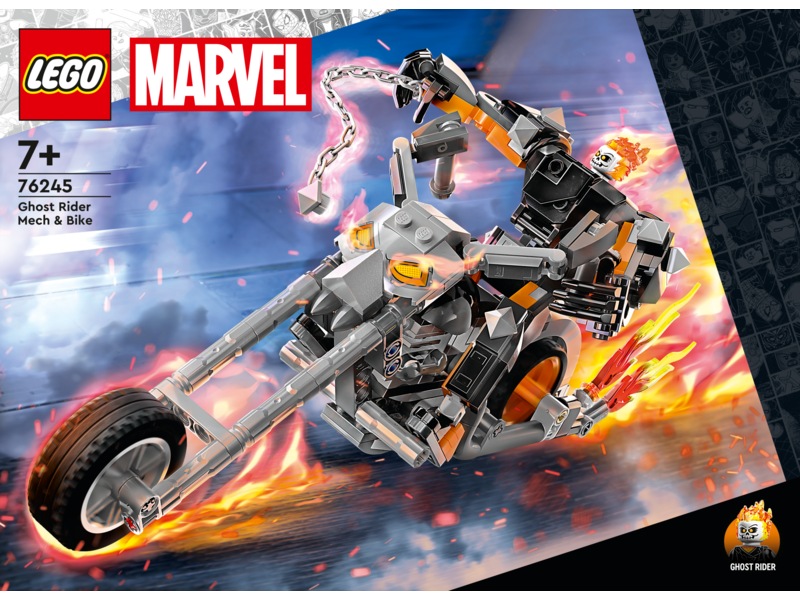 - Ikoniska karaktärer – Med en minifigur av Ghost Rider, en byggbar Ghost Rider-robot med helt ledade armar ben och fingrar, och en storskalig motorcykel som roboten kan fästas på
