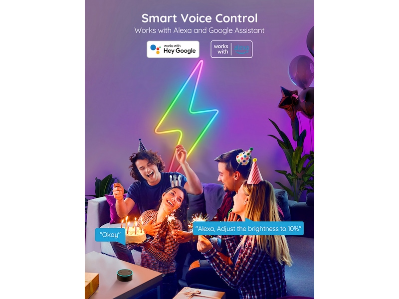 Para ihop din lampa med Alexa och Google Assistant för att komma åt funktionen Smart Voice Control. Få handsfree-åtkomst till olika funktioner i Govee Home-appen som musikläge, där din lampa synkroniseras med ditt favoritljud.