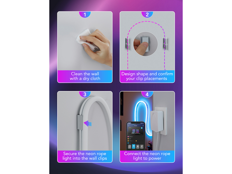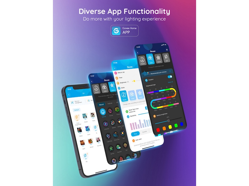 Använd Govee Home-appen för att få tillgång till ett urval av ljuseffekter som bäst passar din personliga estetik. Ljuset kommer att lysa i olika neonliknande färger för att skapa en mjuk och behaglig atmosfär i alla delar av ditt rum.