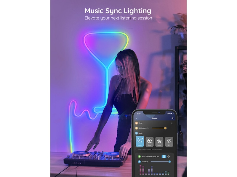 Med 11 reaktiva musiklägen kan neonljuset i repet ändra ljusstyrka och färg samtidigt när musiken ändras, vilket ger dig en verklig spelscen.