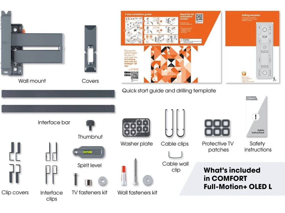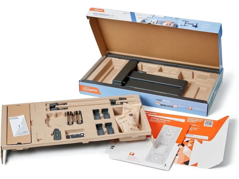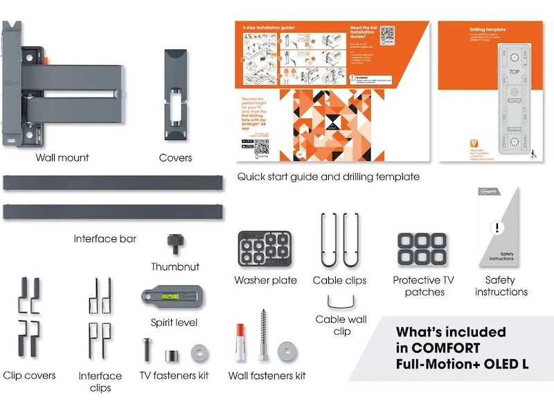 COMFORT Full-Motion+ TV-väggfästet är lätt att installera. En borrmall, skruvar, Fischer® DuoPower-pluggar, kabelband och ett vattenpass ingår redan i förpackningen. Med vår gratis DrillRight™ AR-app är det enkelt att markera det första borrhålet. Är din tv monterad lite snett? Du kan även justera nivån på TV:n efter att ha monterat den på väggen.