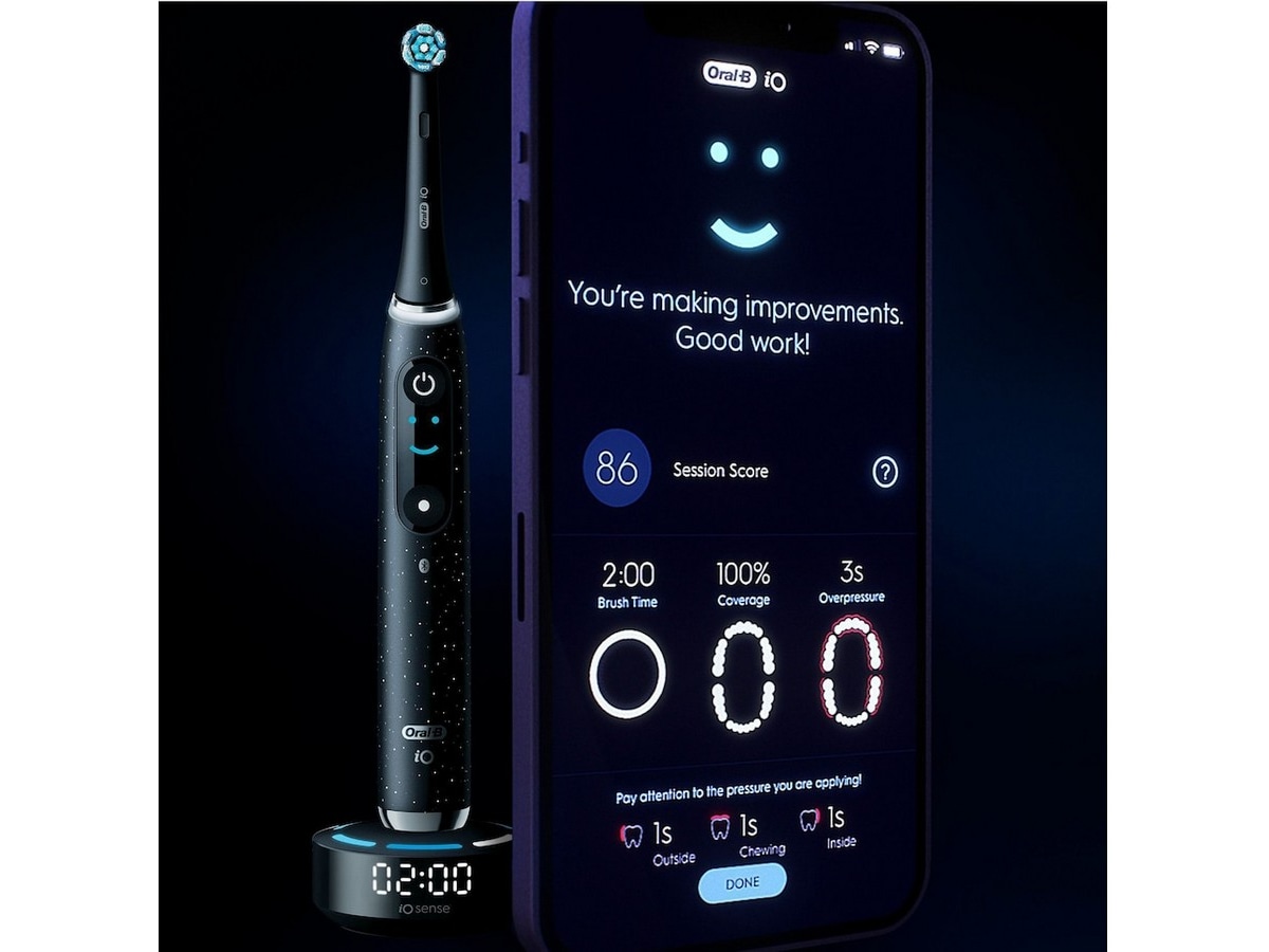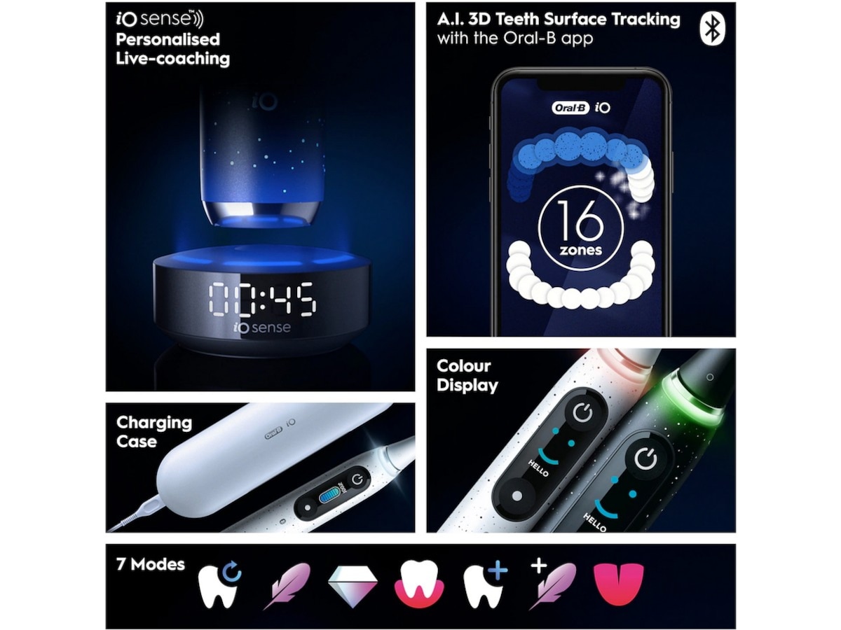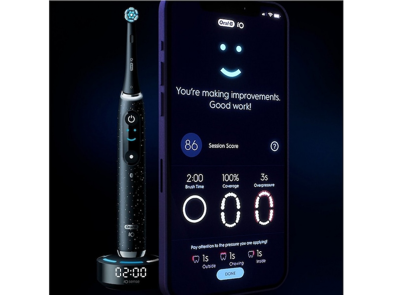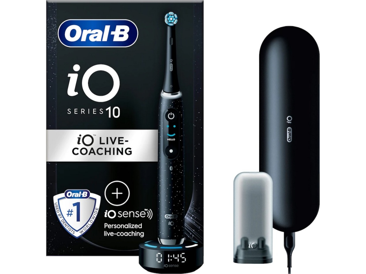 iO 10 eltandborste med revolutionerande iO Sense smart laddare anpassar din borstning med realtidssvar och guidar dig för perfekt täckning, borstningstid och borsttryck för en härlig, enkel rengöring.