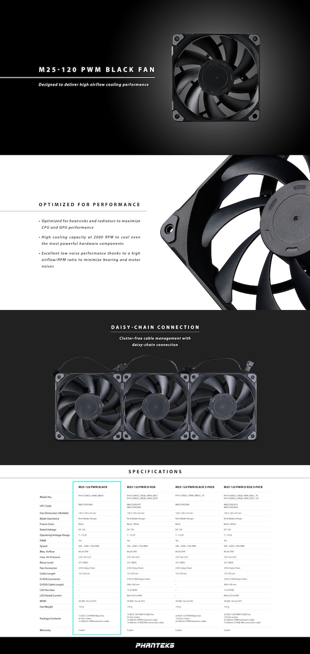 The Phanteks M25 fans build upon the award winning T30 fan to keep next gen hardware cool with high airflow cooling performance. The M25 fan blades are specifically optimized to perform the best with fine mesh/dust filters, heatsinks and radiators with reduced RPM levels. This optimization keeps unwanted bearing noises at a minimum while also leaving plenty of cooling headroom, when necessary, by going full speed. By sharing some of its design with the T30, the M25 stands out by delivering higher airflow through heatsinks and radiators with lower RPM levels with exceptional value. The wide RPM range, up to 2000 RPM, can be precisely controlled through PWM to ensure the M25 is excellent for both quiet and high-end gaming systems.
