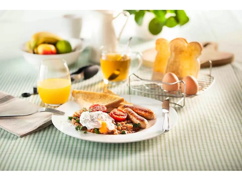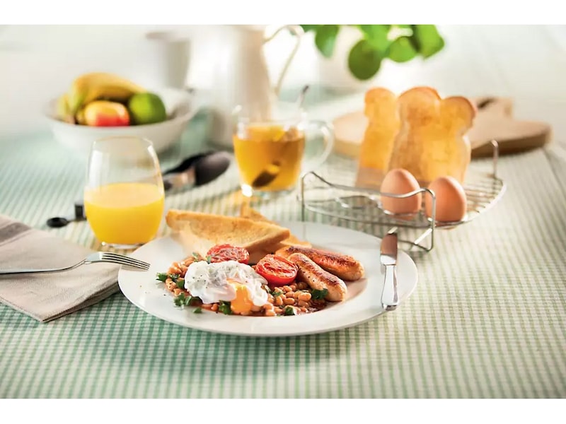 Med den särskilda Philips Airfryer-frukostsatsen kan du laga kompletta frukostar till hela familjen på en enda gång. Bemästra konsten att laga en nyttig frukost med pocherade ägg, toast, korvar och grönsaker