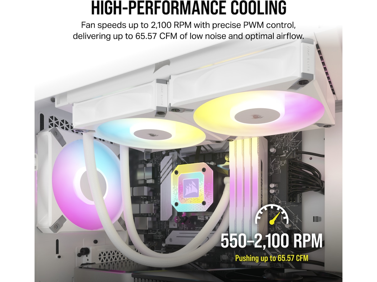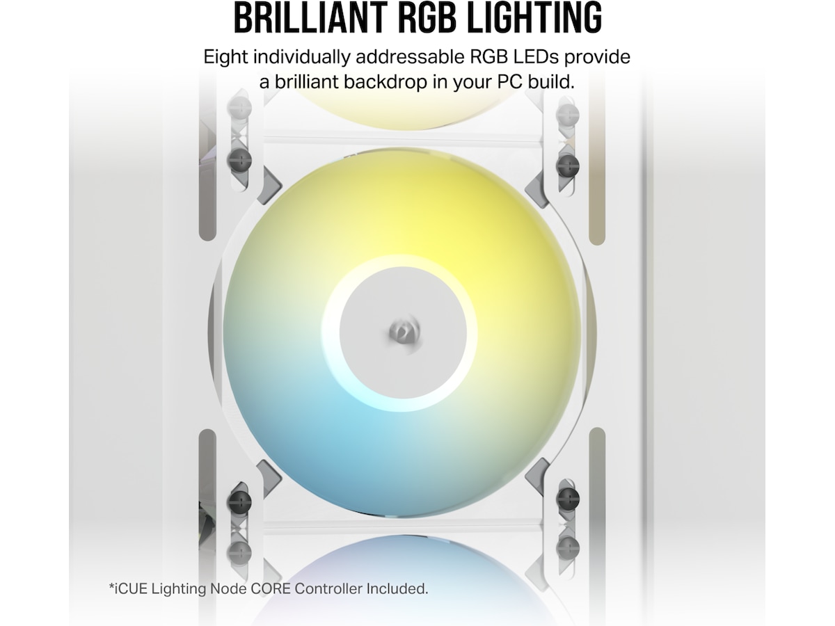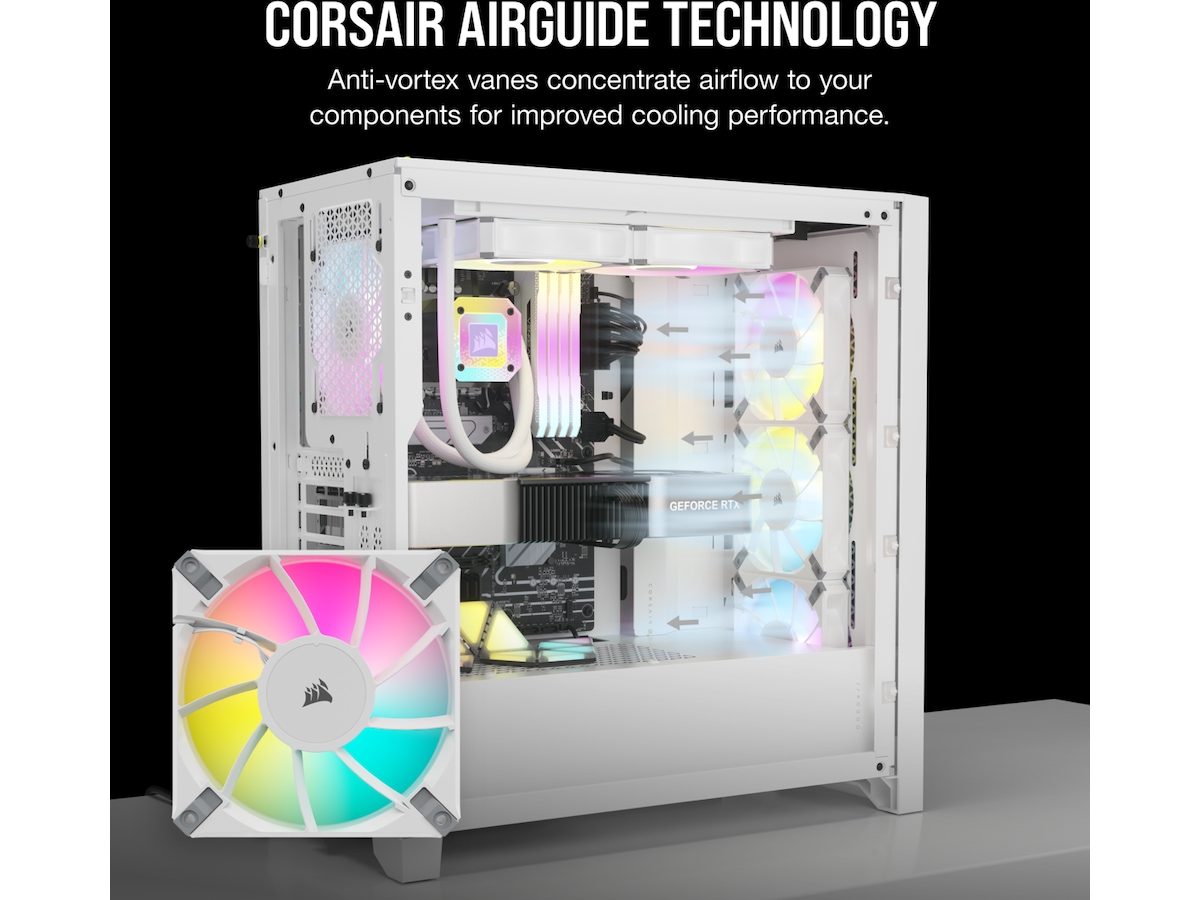 Egenskaper Stöd för PVM (Pulse-width modulation), CORSAIR AirGuide-teknik, ARGB LED-belysning, Zero RPM-fläktläge, Virvelhämmande lameller