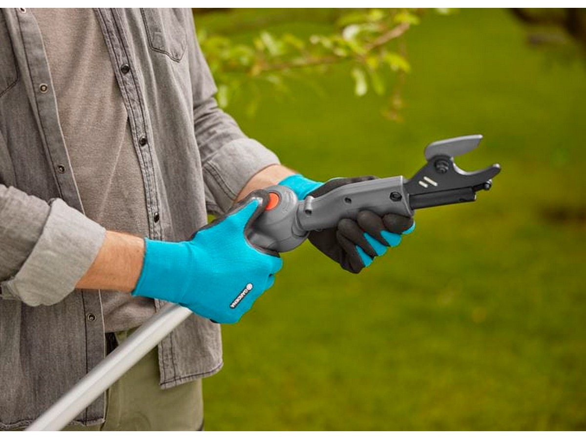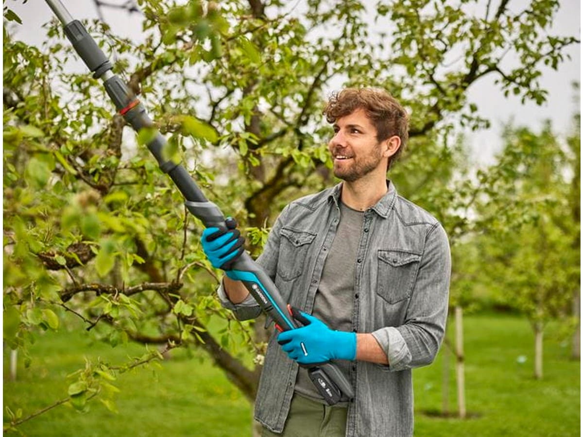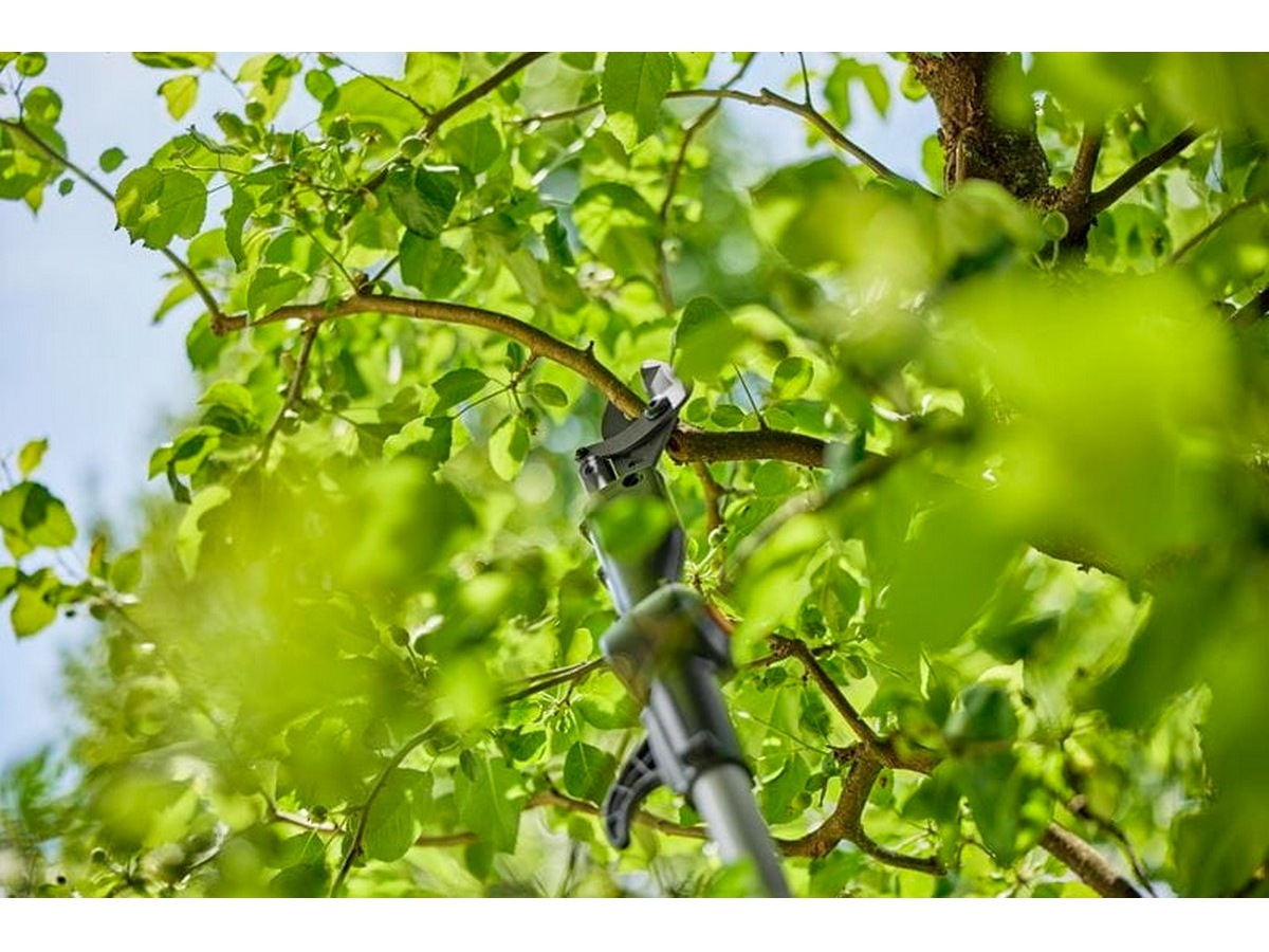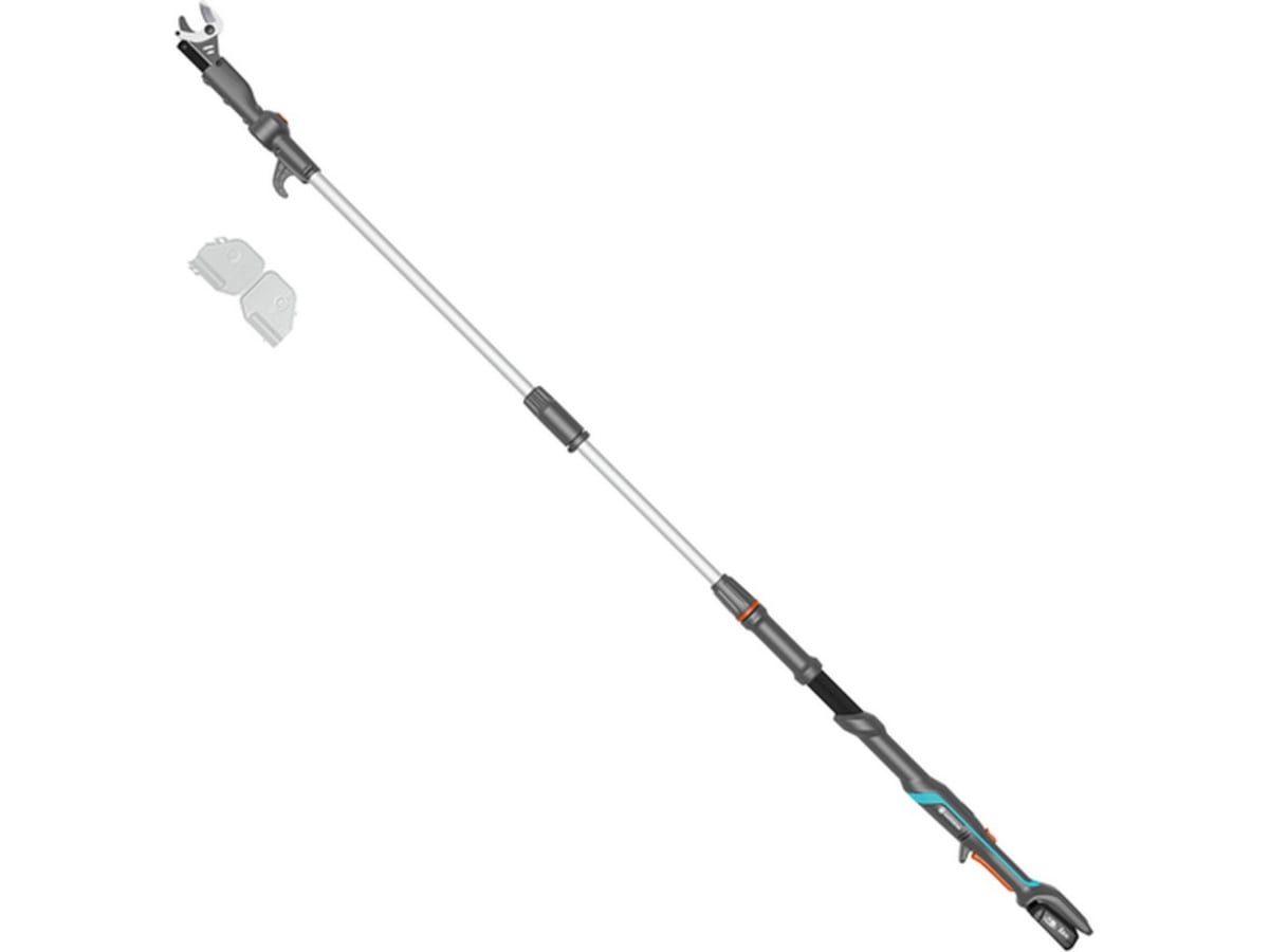 Batteridriven teleskopisk Stångsax 250/18V P4A Komplett Set från GARDENA hjälper dig att enkelt beskära på höga höjder från marken. Den teleskopiska stångsaxen når en längd på upp till 2,5 meter och gör att du totalt kan nå upp till 4 meter vid beskärning. Tack vare den avtagbara axeln är teleskopiska stångsaxen lätt att transportera och förvara.