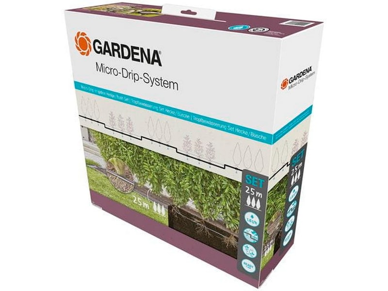 Droppbevattningsrör för buskar eller häckar (25 m) från GARDENA är lika lämpliga för installation över som under jord. Ett tryckkompenserande dropphuvud är inbyggt var 30:e cm längs droppbevattningsröret och är därför lämpligt för att vattna buskar eller häckar.