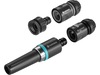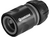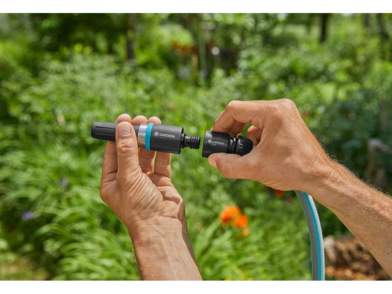 EcoLine Starter Set består av en krankoppling, adapter, slangkoppling och jetrör med vattenstopp. Jetröret kan jämnt justeras mellan en tät stråle, till exempel för städarbete, och en skonsam dusch, till exempel för bevattning i trädgården.