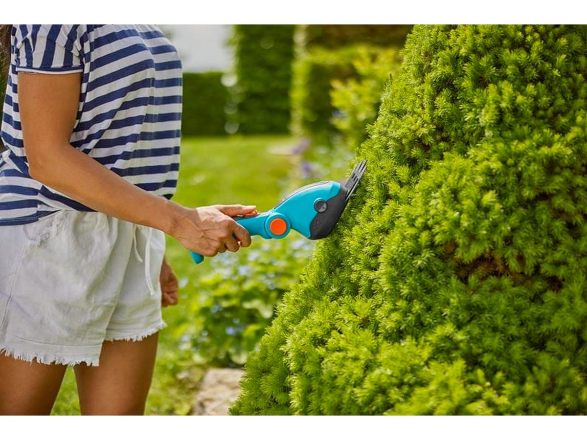 En praktisk och batteridrivna grässax för exakt klippning av gräskanter och små buskar