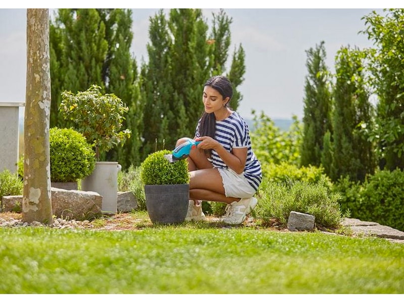 Den batteridrivna grässax ComfortCut Li från GARDENA hjälper dig att klippa gräskanter och små buskar som exempelvis buxbom. Bladet har precisionsslipats och har en klibbfri beläggning för långvarig skärpa. Den ger en jämn, exakt och ren klippning. Kvalitetsbladen tillverkas i Tyskland.
