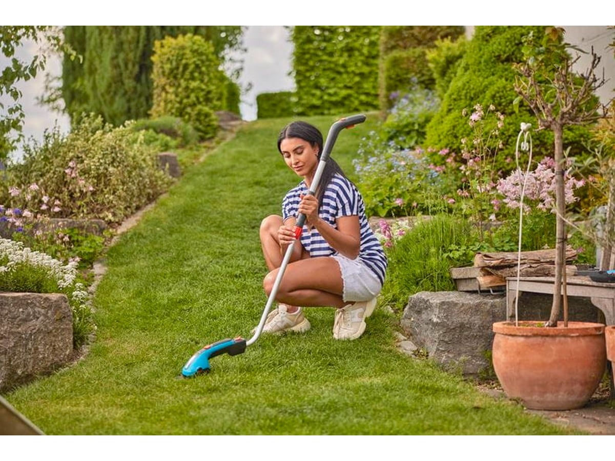Den batteridrivna grässaxen kan omvandlas till en busksax med det separat tillgängliga buskbladet (art.nr. 9863-20).
