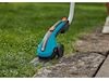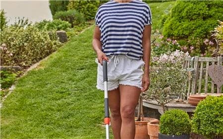 Grässaxen sticker ut tack vare sin slimmade design. Det ergonomiska handtaget ligger bekvämt i handen och möjliggör enkel styrning på marken. Teleskophandtaget med ergonomiskt grepp är höj- och sänkbart mellan 74 och 96 cm. När den används i kombination med hjulen kan den användas i upprätt läge utan att man behöver böja sig.