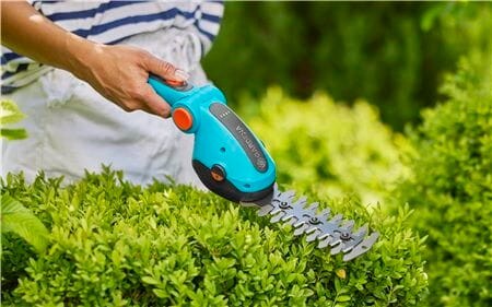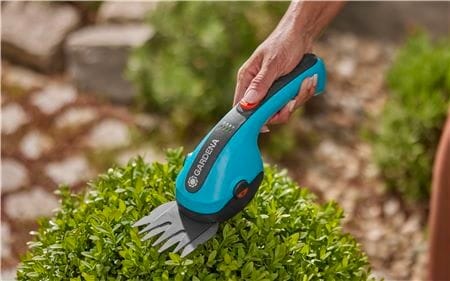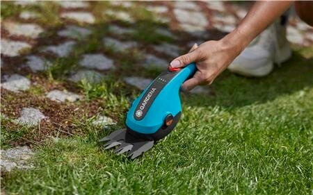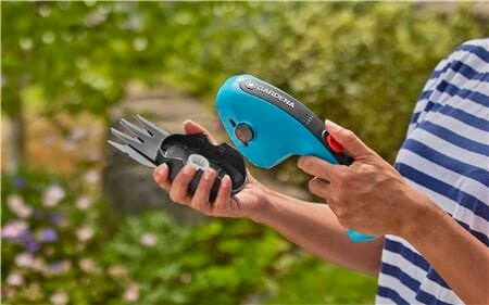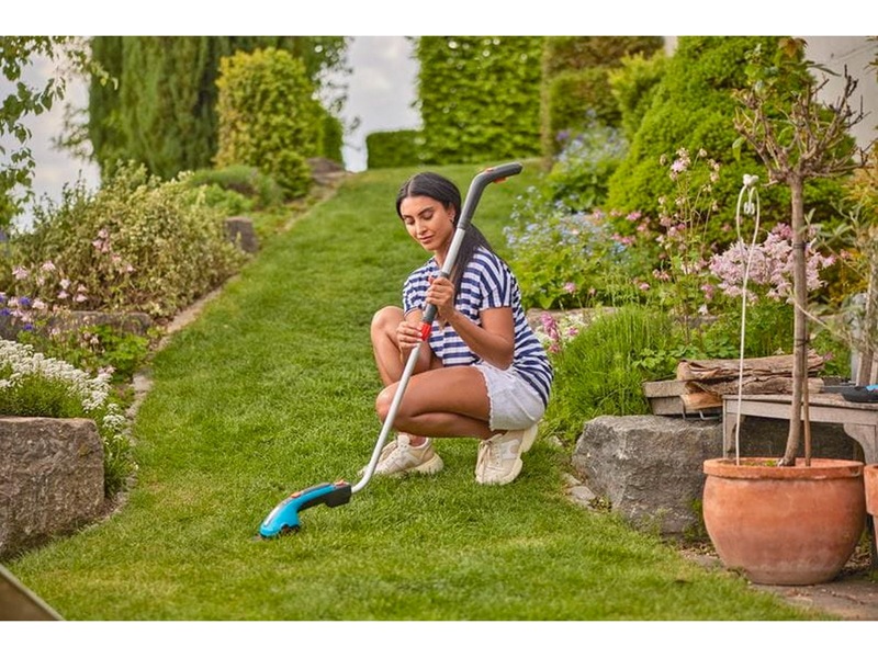 Den batteridrivna grässaxen kan omvandlas till en busksax med det separat tillgängliga buskbladet (art.nr. 9863-20).