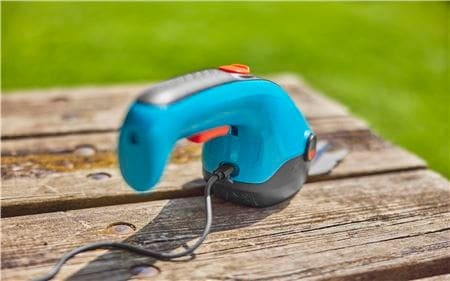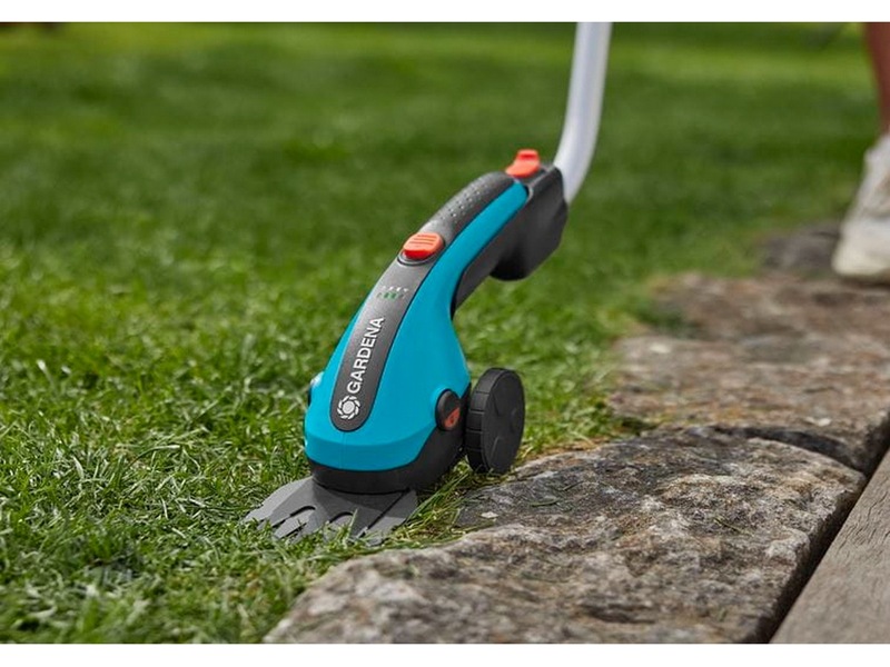 Det inbyggda litiumjonbatteriet driver grässaxen, är lätt att underhålla och uppladdningsbart. Laddningsstatusen indikeras av en LED-display. Drifttiden är cirka 50 minuter med en fulladdad sax. Batteriet laddas med den medföljande USB-C-kabeln.