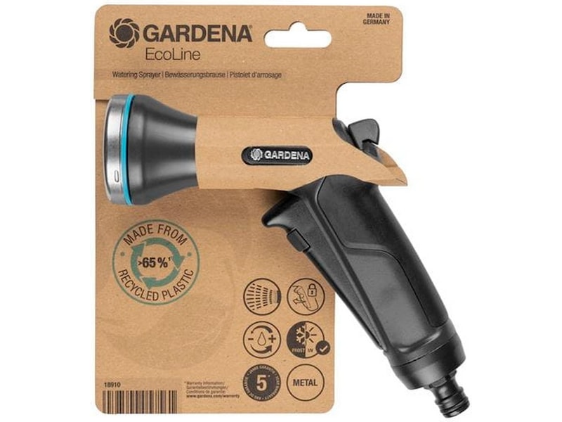GARDENA EcoLine duschpistol är idealisk för vattning av krukväxter och rabatter. Produkten är tillverkad av kvalitetsplast och metall, där mer än 65 % av plasten och 45 % av metallen är gjord av återvunnet material, främst från privata hushåll. Designen är tidlös och lämpar sig för användning i trädgården och på balkongen.