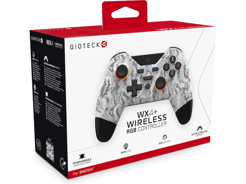 Uppgradera till den senaste versionen av vår bästsäljare, WX4+ Wireless RGB Controller for Switch™ från GIOTECK har nu anpassningsbar RGB-belysning, vilket förbättrar din spelupplevelse. Programmerbara bakåtknappar, snabbutlösare och en exakt riktningsplatta kombinerar blixtsnabb prestanda.