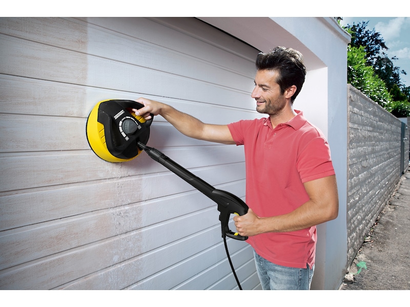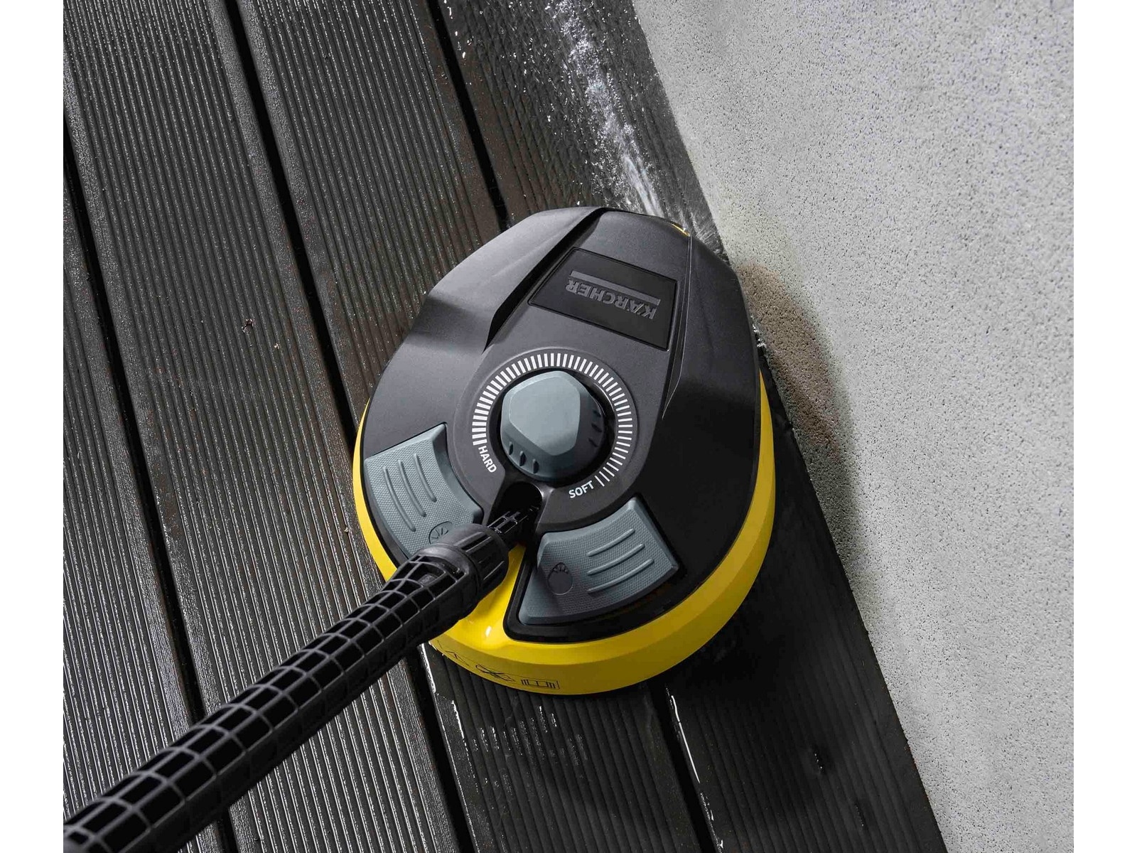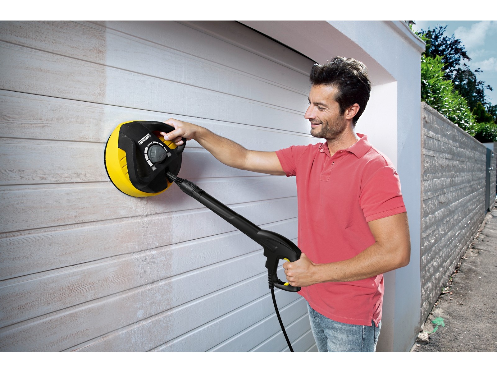T7 är ett effektivt verktyg för rengöring utomhus utan stänk. Den roterande twin-jet-armen tar bort smuts från plattorna och andra stora ytor, vilket sparar ca. 50 procent av din tid jämfört med rengöring med en sprutlans. Den spetsiga designen säkerställer effektiv rengöring i hörn och kanter.