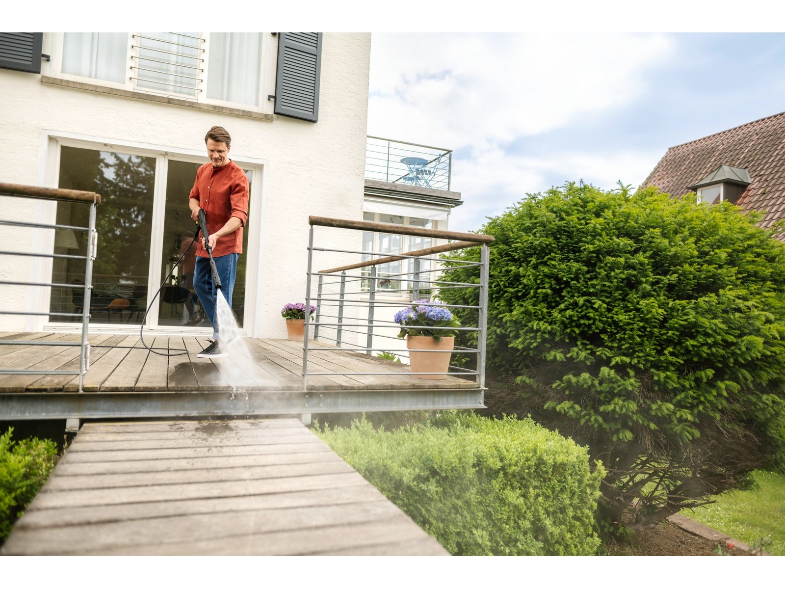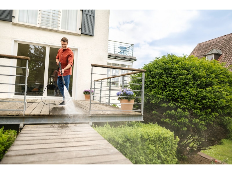 Högtryckstvätten är utrustad med en kraftfull vattenkyld motor och har en avtryckarpistol med Quick Connect snabbkopplingssystem och en 8 meter lång högtrycksslang. Det finns även en Vario Power sprutlans (VPS) som gör det enkelt att ställa in önskat tryck och ger skonsam behandling av ömtåliga ytor, samt ett sprutrör med en kraftig roterande stråle för att tackla den mest envisa smutsen. Det integrerade vattenfiltret skyddar pumpen.
