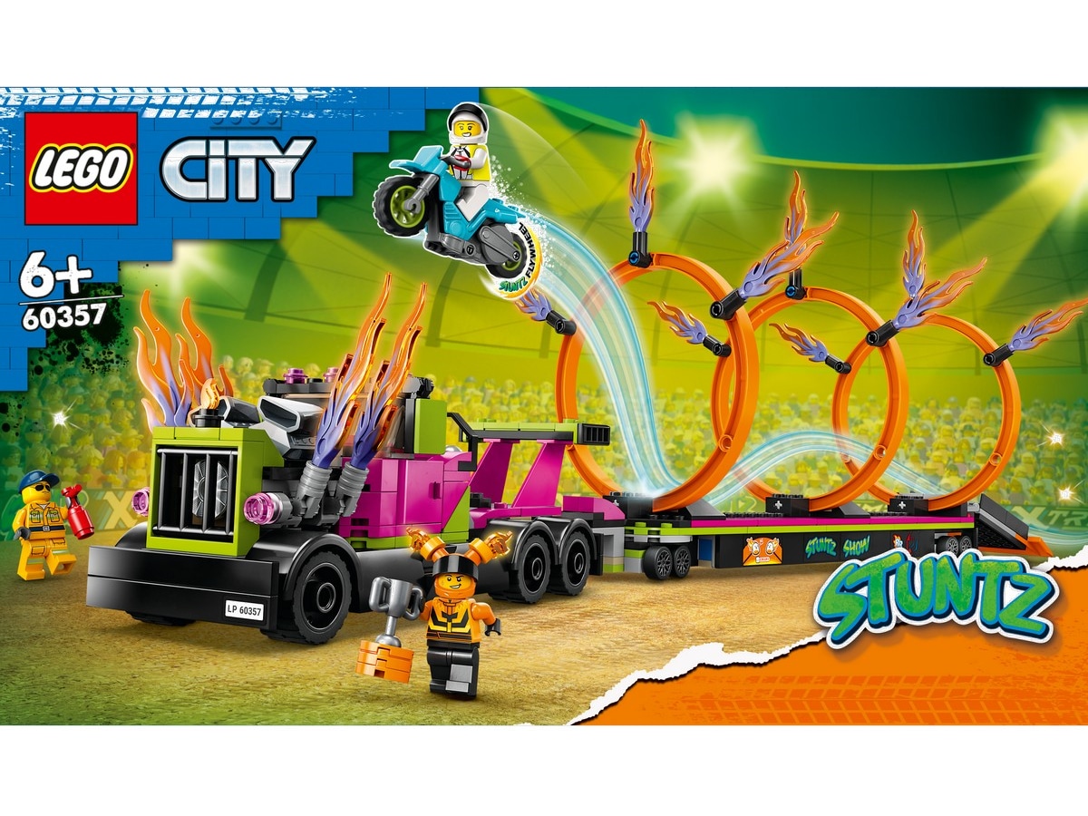 - Vad finns i lådan? – Allt barn behöver för att bygga en bil med flammande avgasrör, en flyghjulsdriven stuntcykel och ett showsläp med 3 eldringar, plus en chaufför och 2 stuntförarminifigurer