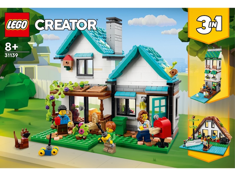 Barn från 8 år kommer att älska att iscensätta roliga berättelser med det imponerande setet LEGO® Creator 3in1 Mysigt hus (31139). Setet har en familjevilla med 4 rum: kök, vardagsrum, sovrum och barnrum, plus en trädgårdsterrass. Huset kan öppnas på mitten för att ge barn ännu fler lekmöjligheter. Roliga leksaker som hänför små byggare Barn kan skapa 3 olika LEGO hus med detta härliga lekset. De kan bygga en familjevilla i 2 våningar med trädgårdsterrass, bygga om den till ett kanalhus i 3 våningar med vindskontor, konstgalleri och kafé eller skapa ett sjöhus vid vattnet med en båt. Varje modell kan anpassas och lekas med i 2 lägen och har 3 minifigurer (2 vuxna och 1 barn), som kan byta kläder och hår för att skapa olika karaktärer. Appen LEGO Builder Ladda ner appen LEGO Builder och kliv in i en ny värld av byggande, där barn kan zooma och rotera modeller i 3D, spara set och hålla reda på sina framsteg.