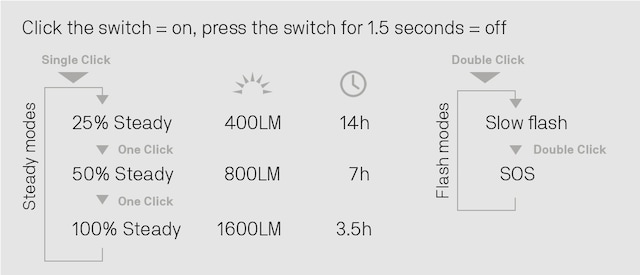 Lampan erbjuder 5 olika ljusinställningar: 25% stadigt - 400 lumen, 50% stadigt - 800 lumen, 100% stadigt - 1600 lumen, långsamt blinkande och SOS-blinkande. Full effektinställning ger ljus i ca. 3,5h, medan 25%-inställningen ger ljus i 14h.