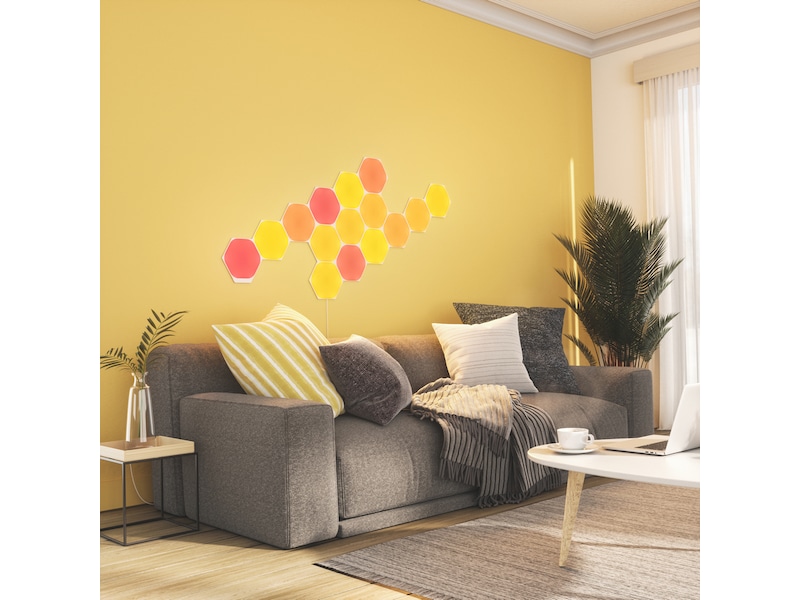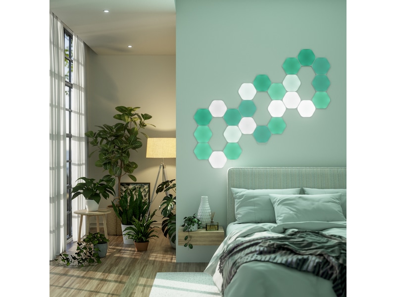 Skapa och anpassa dina egna scener och spellistor med Nanoleaf-appen. För att installera den monteras den helt enkelt på väggen med det medföljande monteringsbandet utan borrning. Hexagons är designad för att fungera med framtida former, och erbjuder gränslös belysning, design och IoT-möjligheter för din smarta heminredning.