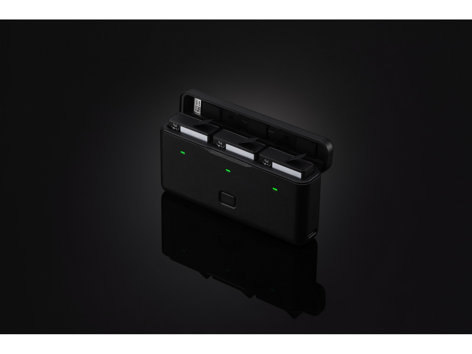 DJI Osmo Action Multifunktionellt batterifodral Lagar tre batterier och två microSD-kort. Intelligent snabbladdar tre batterier och kan användas tillsammans med dessa batterier som en powerbank för att ladda andra enheter som en smartphone.