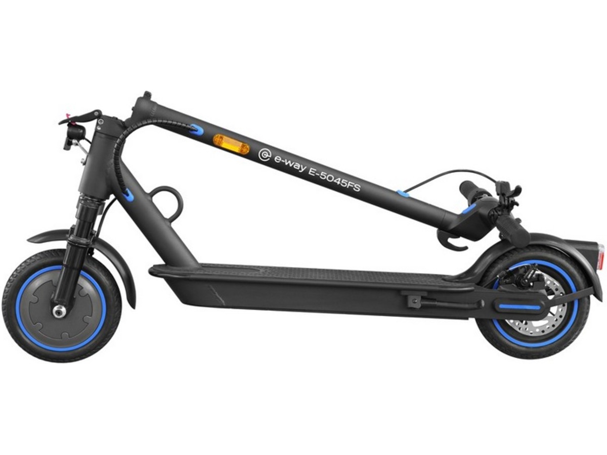 Elsparkcykeln E-Way E-5045FS kommer med en 500 watts motor, 1000 watt maxeffekt, fjädring fram och kan köras i upp till 45 km per laddning. Den är kraftfull nog att köra uppför backar med 25 % lutning. Tänk på att personens vikt kommer att påverka elsparkcykelns prestanda.