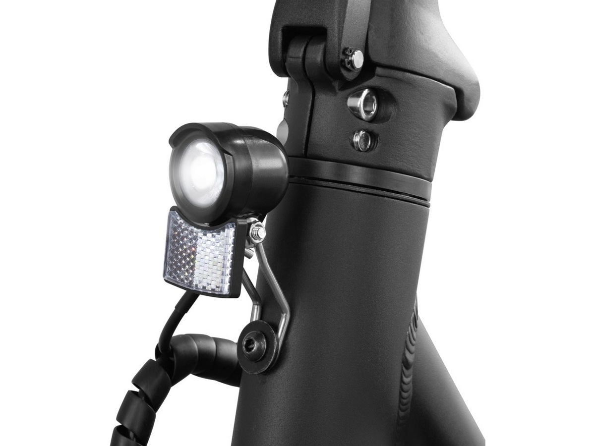 Elsparkcykeln går att fälla ihop vilket gör att den enkelt kan bäras med och tas med på till exempel buss, tåg eller bil.