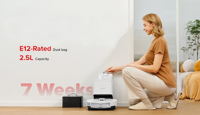 Auto tömmer damm och smuts i den E12-klassade 2,5L dammpåsen, som har en självförseglad design, efter varje rengöring, i upp till 7 veckor* utan att ändras.