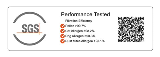 Dammpåsen är också ett effektivt luftfilter, testat för att filtrera 99,7 % av pollen så lite som 0,3 mikron, för att hålla din luft ren och pollenfri.