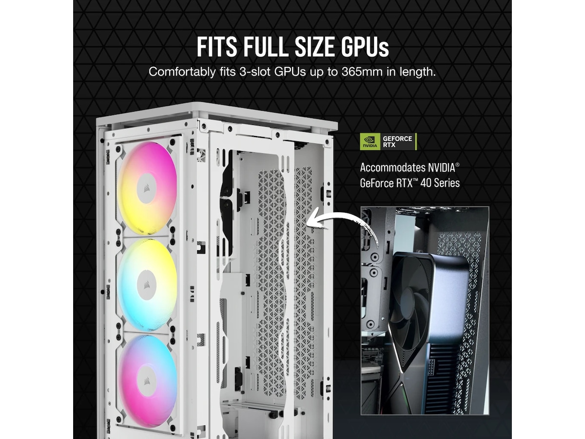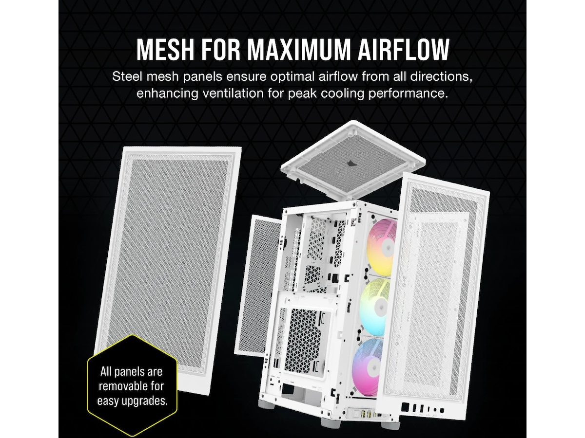 Egenskaper hos systemkabinett Bakre panelgaller, Sidopanel i nät, CORSAIR iCUE RGB-program, övre panel med galler, Frontpanel med nät