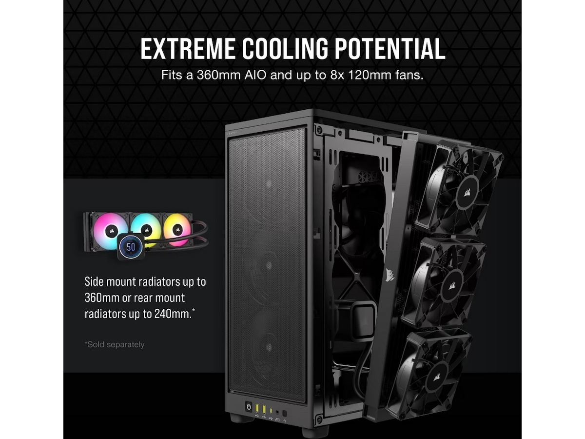 Stöd för flera AIO-kylare inklusive 360 mm på sidan och 240 mm på baksidan (med en 1-slot GPU).
