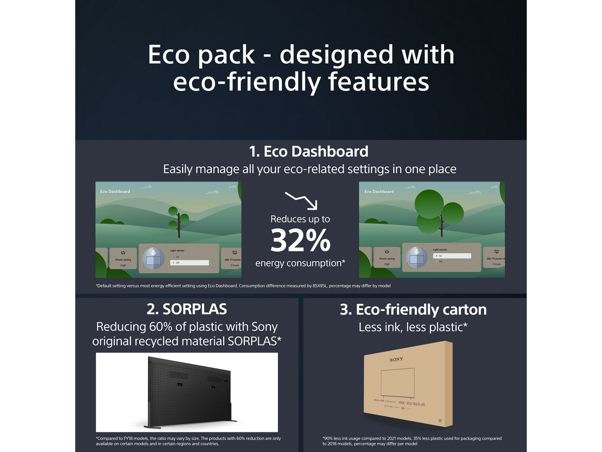 | Egenskaper | Audio Description (AD), Textförstoring, Inbyggd Chromecast, Stöd för BRAVIA CAM, Vilolägestimer, Dubbel databasbehandling, CalMAN autokalibreringsstöd, Skärmläsare |