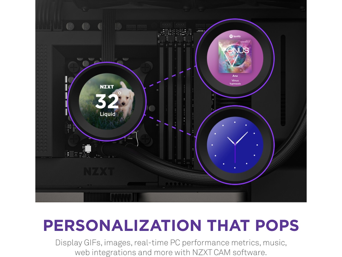Få högpresterande kylning, visa en favoritanimerad GIF eller statisk bild, övervaka PC-prestandastatistik i realtid, se musik som spelas just nu, streama webbläsarinnehåll och mer med NZXT CAM-programvaran.