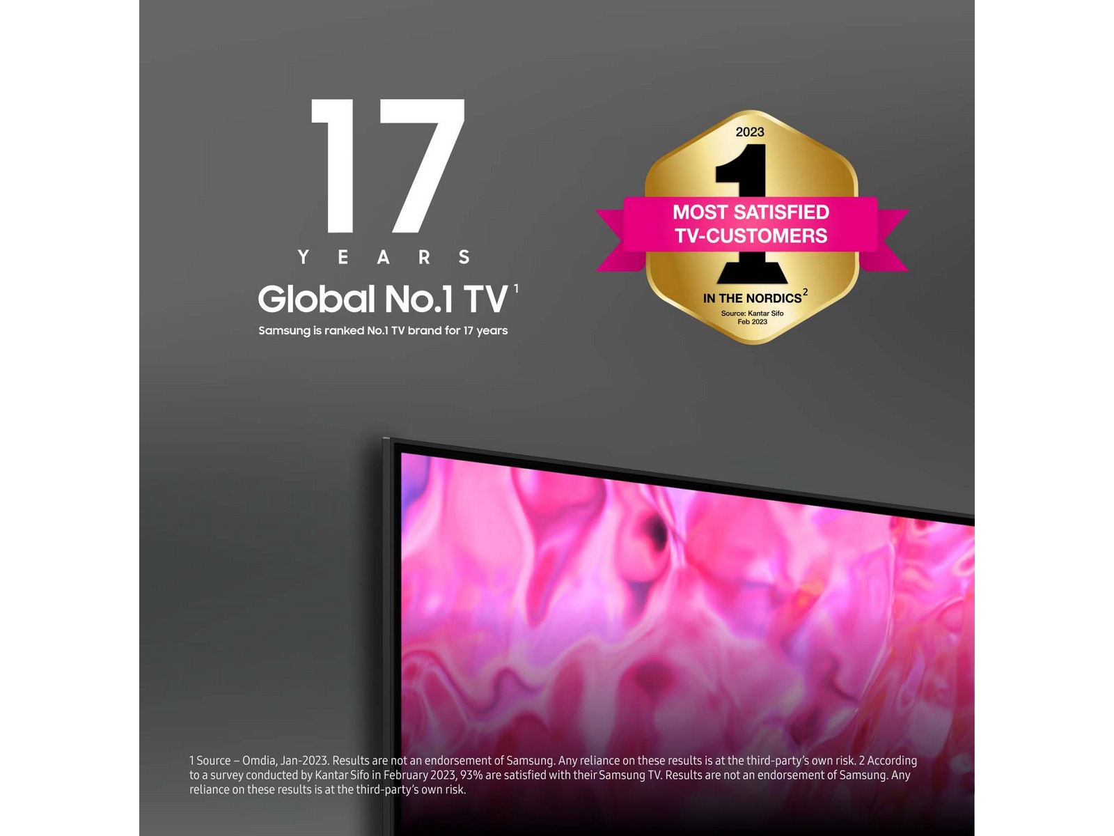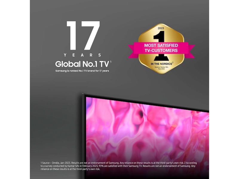 2. Enligt en undersökning utförd av Kantar Sifo genomförd i januari 2023 är 93 % nöjda med sin Samsung TV. Resultaten är inte ett marknadsföringsbudskap från Samsung. Eventuella hänvisningar till dessa resultat sker på egen risk av tredje part.