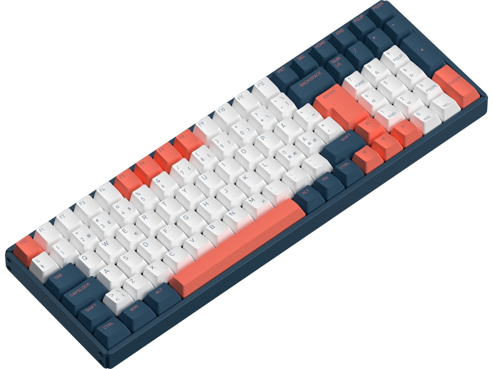 Kompakt layout med 100 nycklar. Det är ett "fullstort" tangentbord som innehåller en numerisk tangentbord men frigör skrivbordsutrymme. Dessutom betonar den ergonomisk design, som bildar en vinkel på 6° med skrivbordet, som matchar krökningen på knapparna och bågarna på mänskliga händer, vilket kan minska handledens belastning och trötthet och ge en mer bekväm skrivupplevelse.