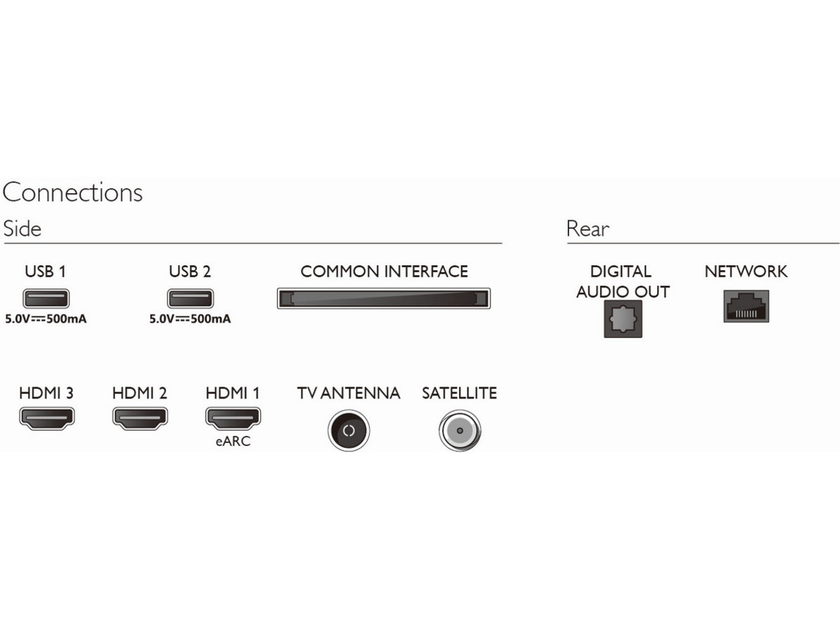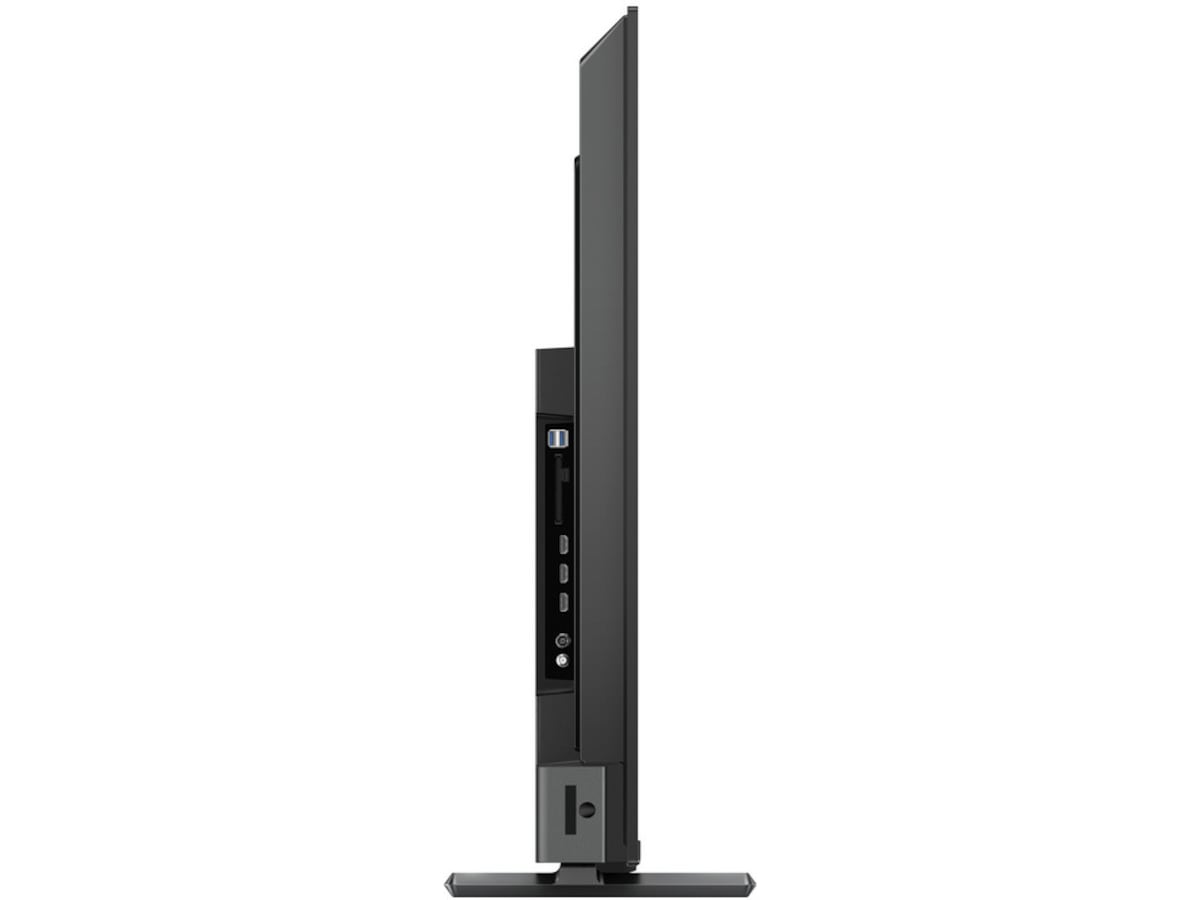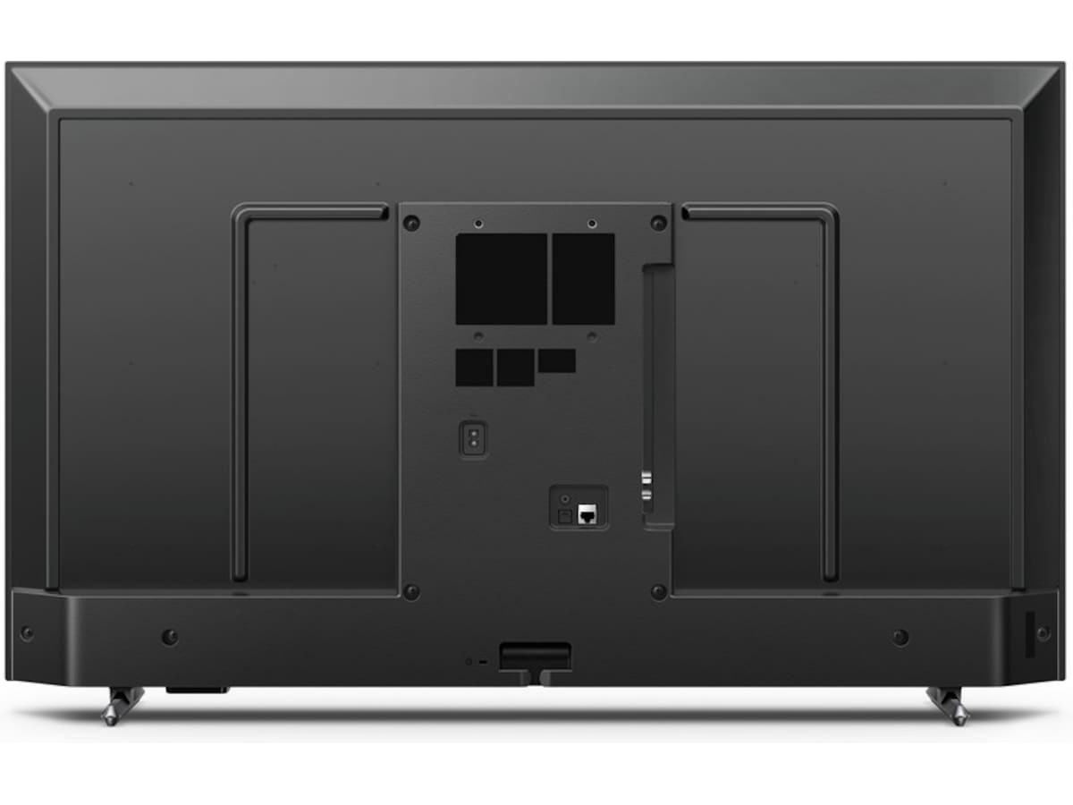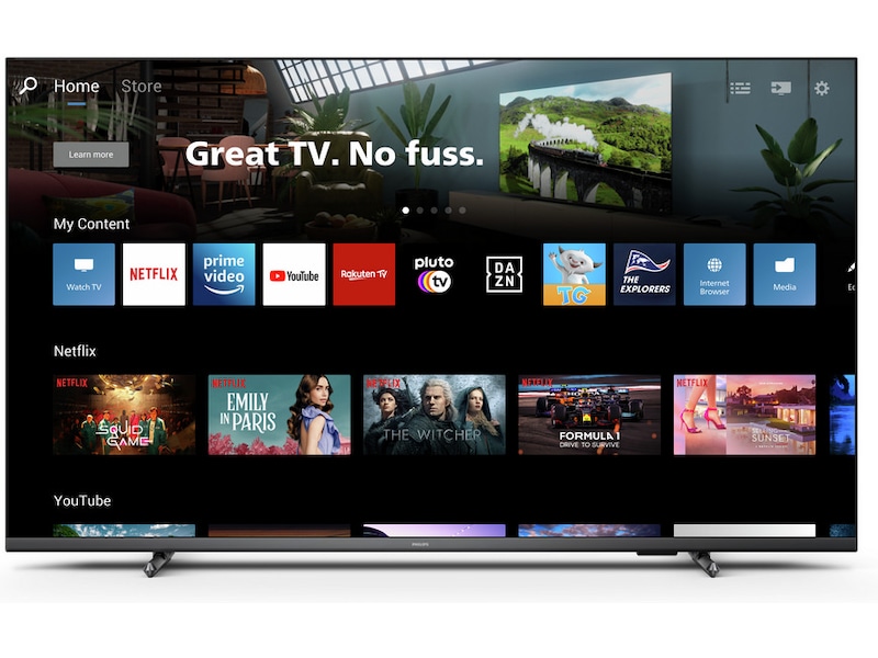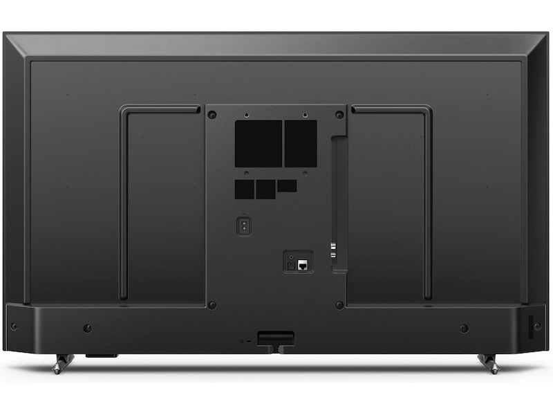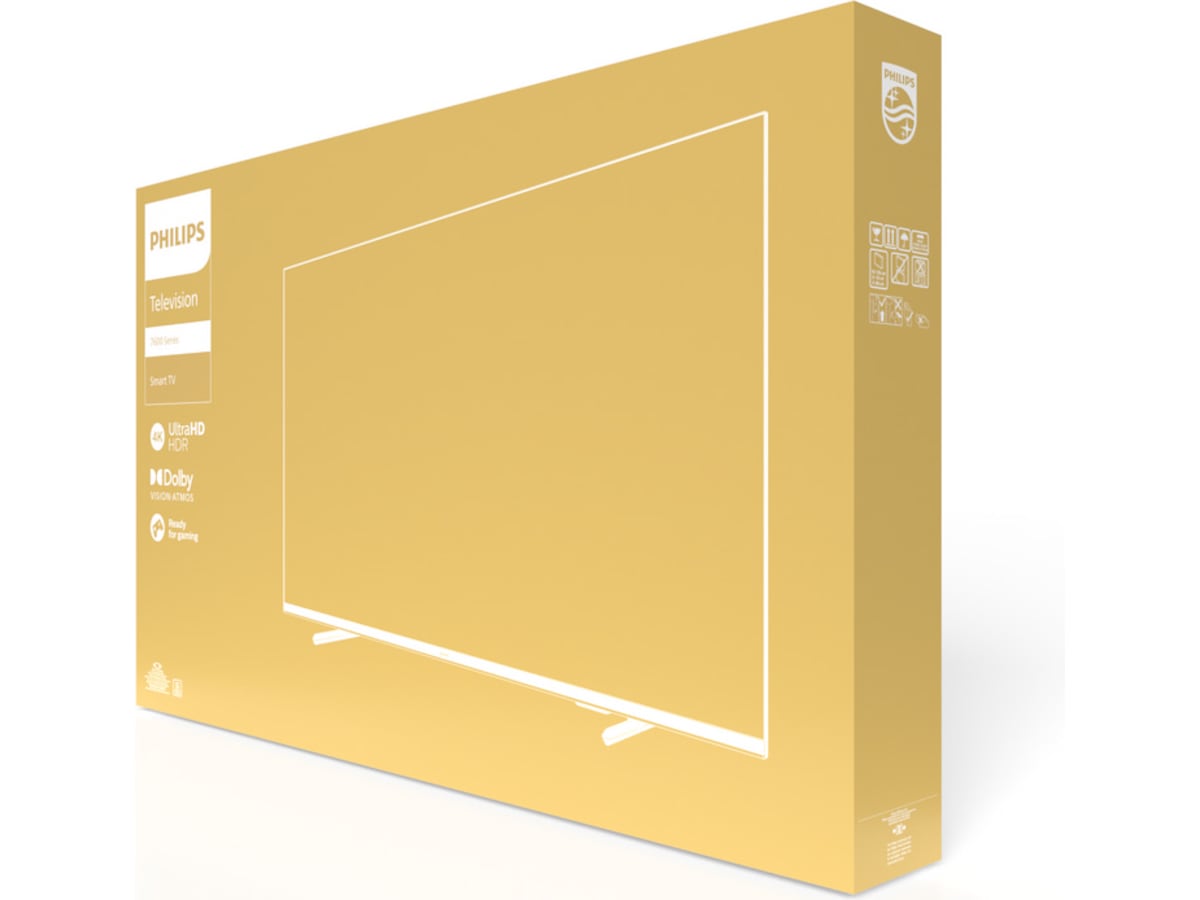 Den praktiskt taget ramlösa skärmen på denna 4K smart -TV passar överallt. De smala, mörkgråa fötterna gör att skärmen ser ut att sväva. Förpackningen är av FSC-certifierad återvunnen kartong och de tryckta materialen kommer i återvunnet papper.