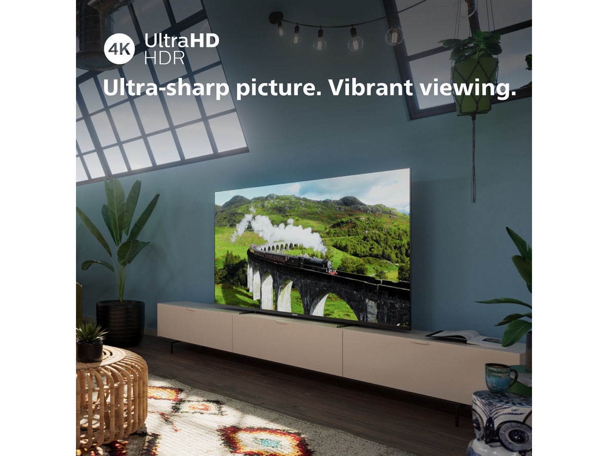 Vad du än tittar på ger denna 4K LED-TV dig en klar, ultraskarp bild med levande färger. Dessutom är TV:n kompatibel med alla de vanligaste HDR-formaten, så du kan se fler detaljer även i mörka och ljusa områden – när du streamar HDR-innehåll.