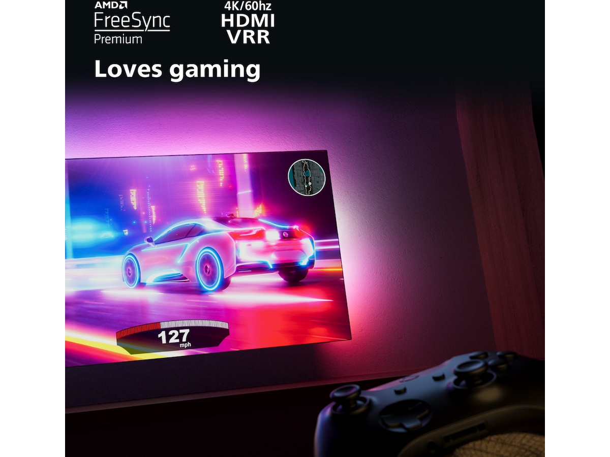 Sugen på att spela? Denna 60 Hz Ambilight TV med HDMI 2.1 stöder snabb spelning och Ultra Motion Clarity-läget ger en skarpare, jämnare bild. När du slår på konsolen aktiveras en ultralåg fördröjningsinställning automatiskt, och Ambilight-spelläget gör spänningen ännu större.
