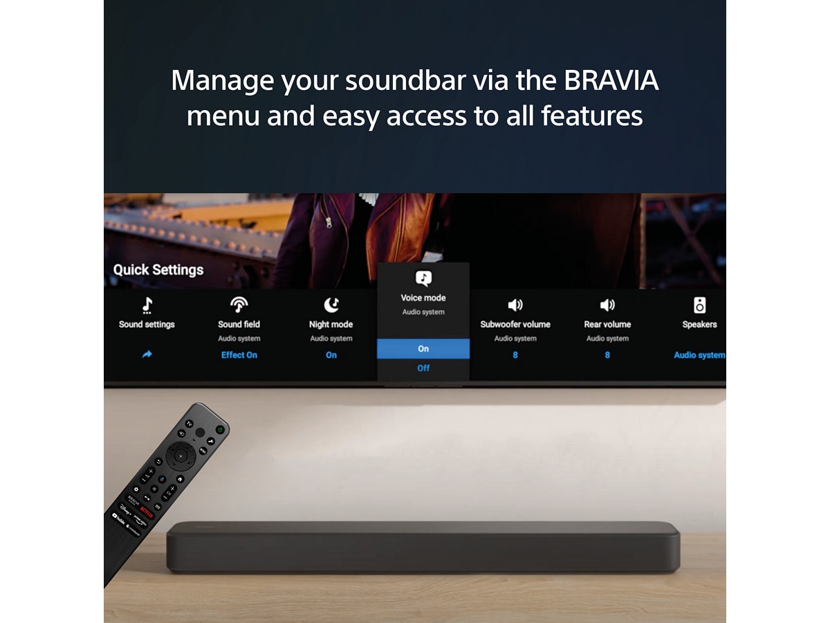Trådlös subwoofer (SA-SW3/SA-SW5) som tillval ger kraftfullt basljud. För ännu mer filmisk spänning och ljud direkt bakom dig, lägg till våra trådlösa bakre högtalare SA-RS3S (tillval). Parat med en kompatibel BRAVIA™-TV visas ljudinställningarna för soundbar automatiskt på BRAVIA Quick Settings-menyn för enkel funktionskontroll.*