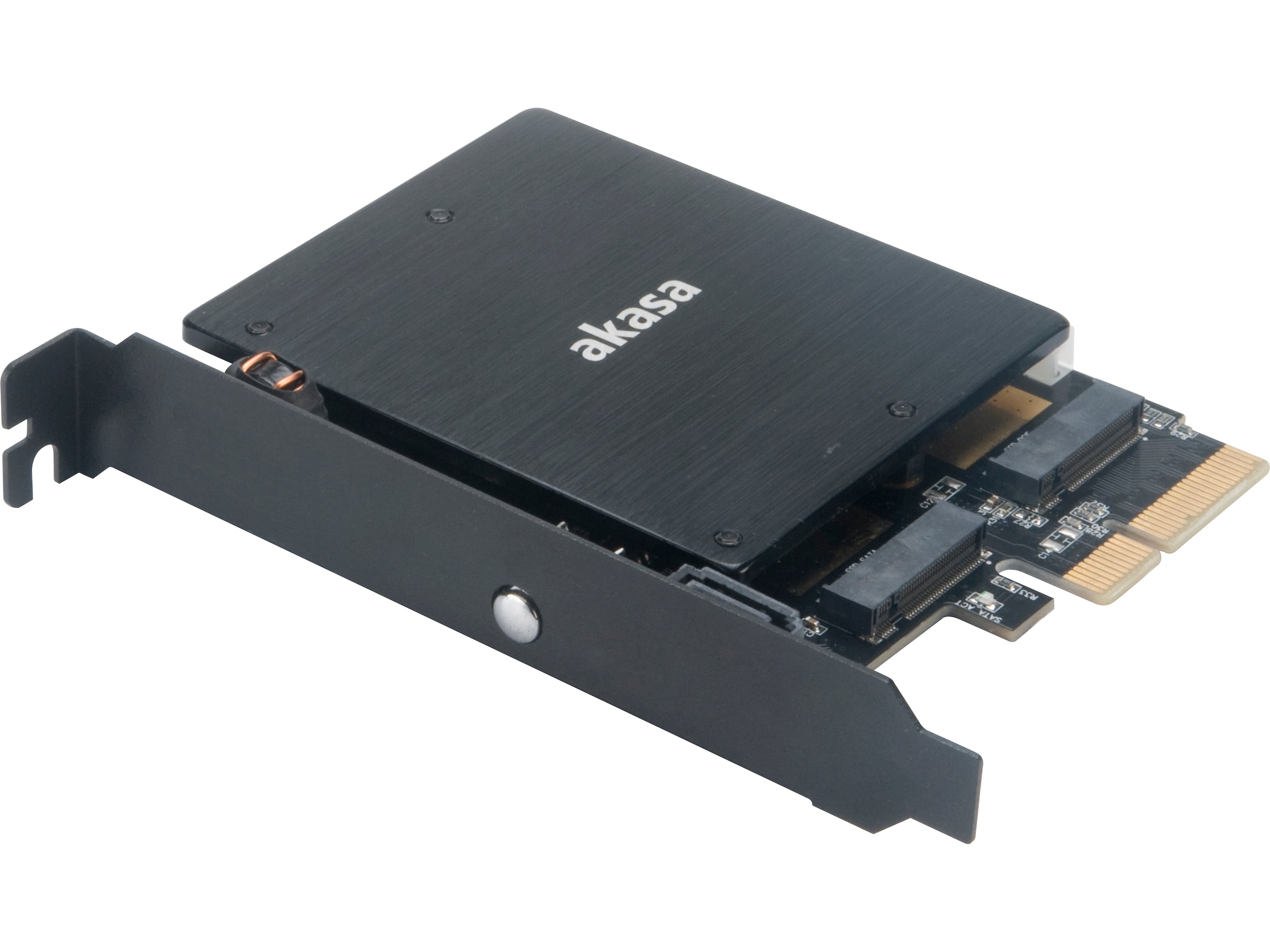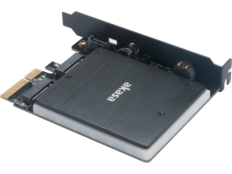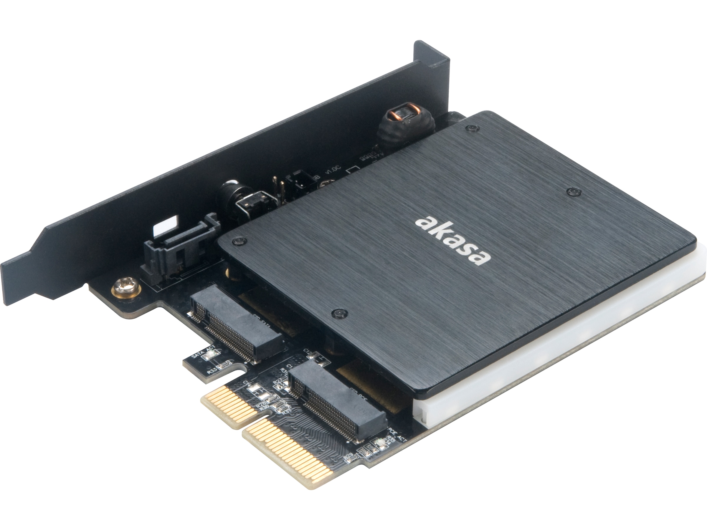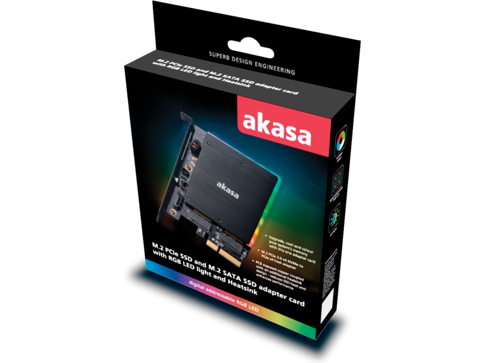 Akasa M.2 PCIe och M.2 SATA SSD-adapter Cool och färg M.2 SSD-lagring. Fungerar samtidigt med en M.2 PCIe (NVMe) SSD och en M.2 SATA SSD. Kompatibel med PCIe 3.0 Gen3 x4, x8 eller x16 kortplats.