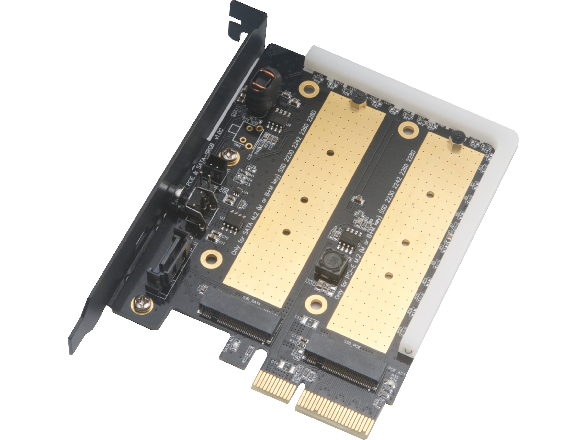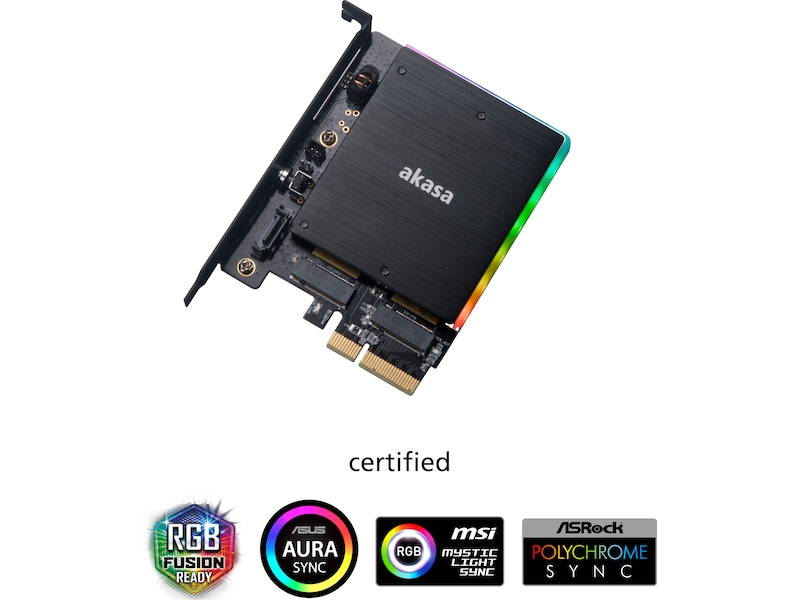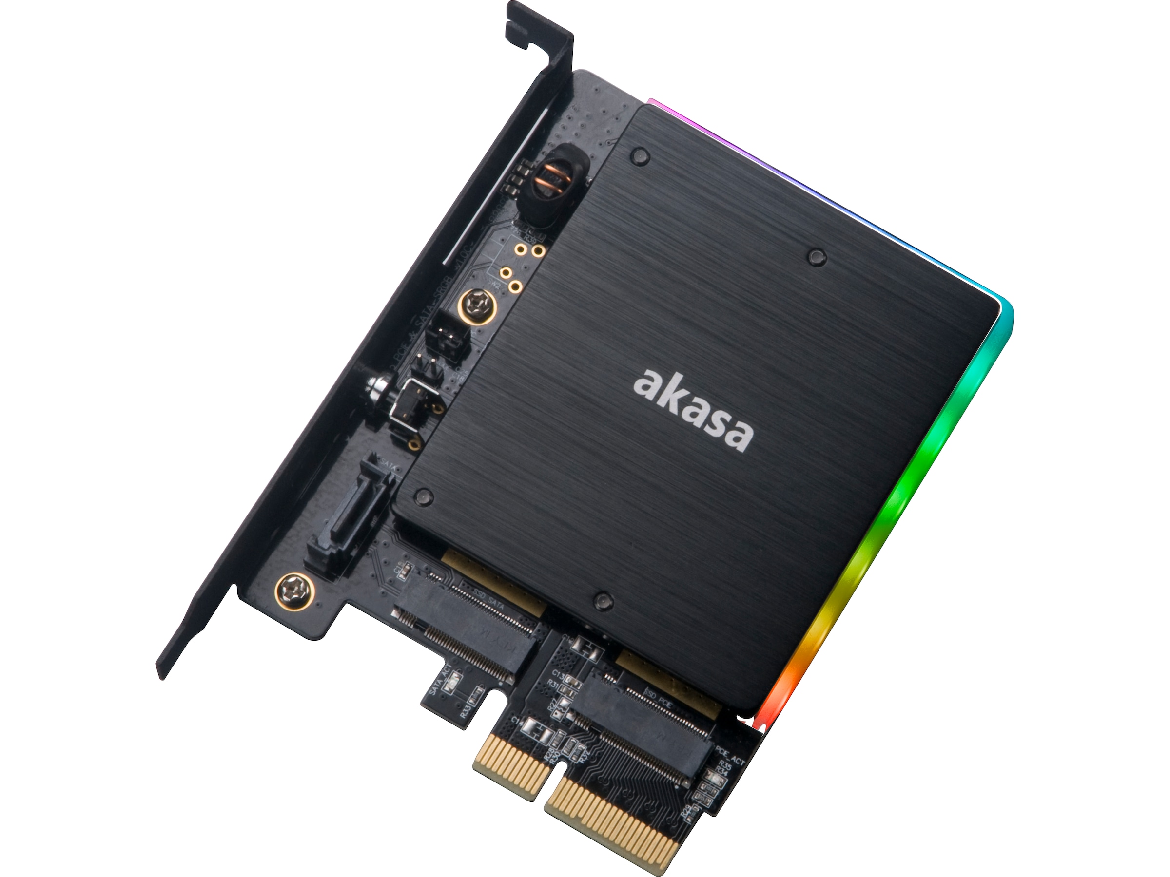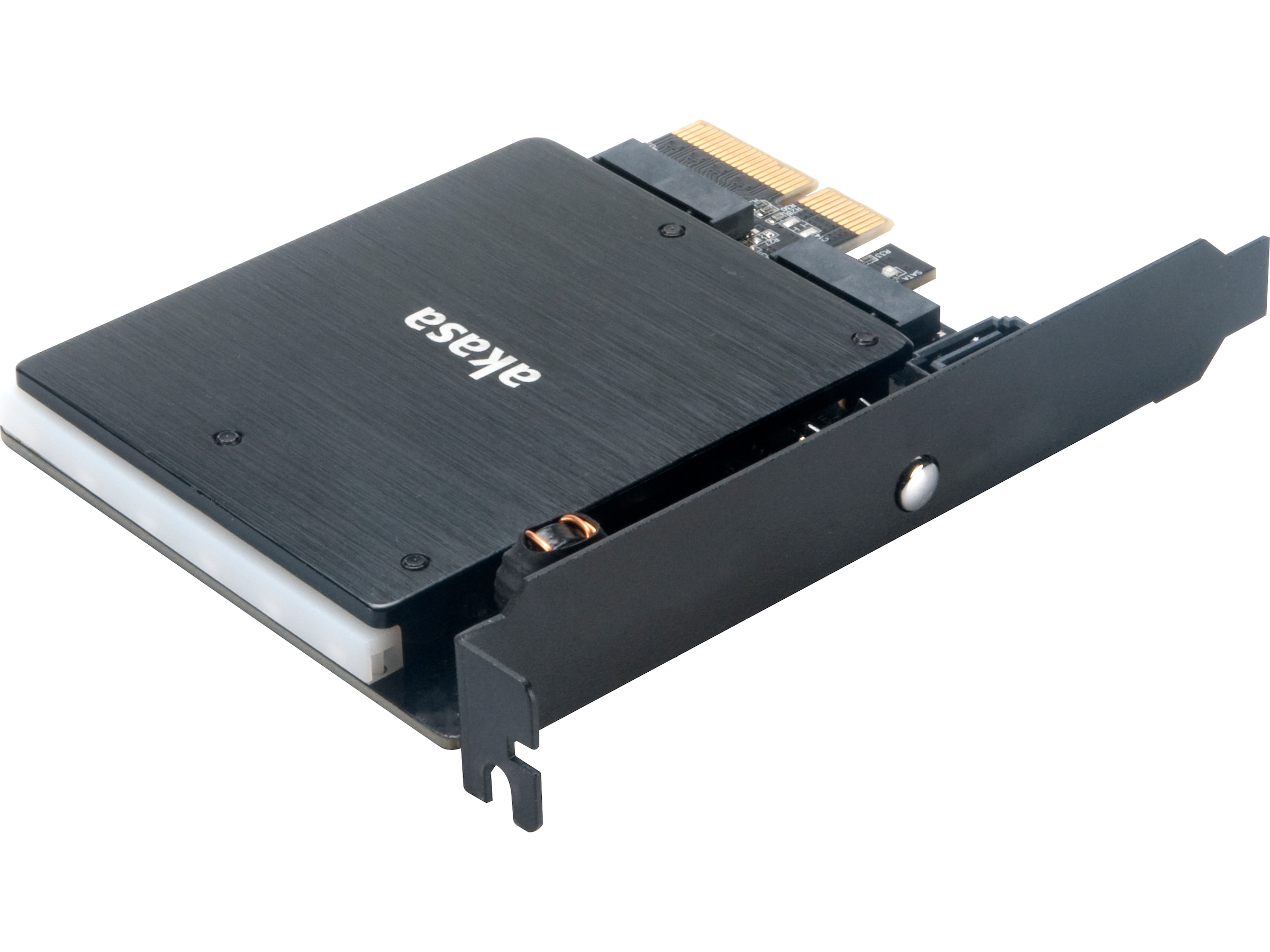 Akasa M.2 PCIe och M.2 SATA SSD-adapter Cool och färg M.2 SSD-lagring. Fungerar samtidigt med en M.2 PCIe (NVMe) SSD och en M.2 SATA SSD. Kompatibel med PCIe 3.0 Gen3 x4, x8 eller x16 kortplats.
