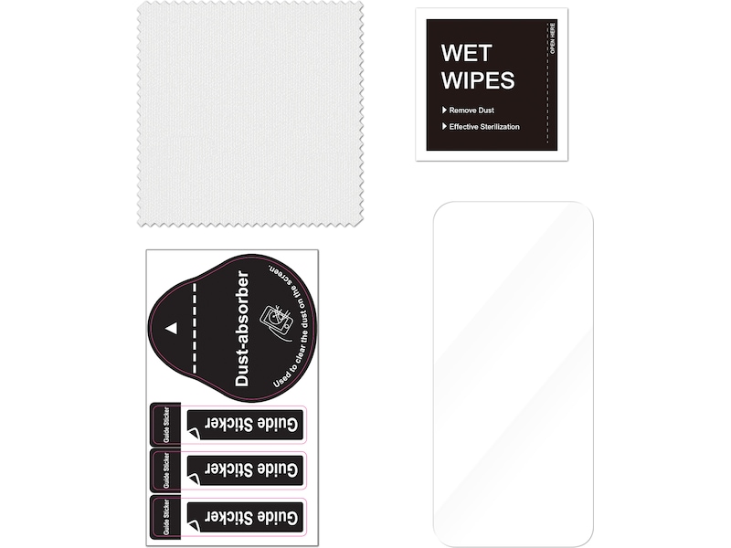 Förpackningsinnehåll Skärmskydd, Våta rengöringsdukar, Rengöringsduk, Dammupptagare, Vägledningsklistermärken