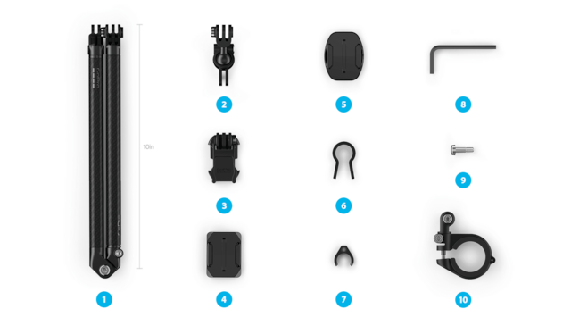 - Inkluderar 2 kolfiberarmar, kulledskamerafäste, Pro-styre/sadelstolpe/stolpefäste, 5 stång/stolpeadaptrar, böjda + platta självhäftande fästen, monteringsspänne, trianguleringsstödreglage, 4 mm insexnyckel, 2 extra sexkantsskruvar, insexnyckel förvaringsklämma och dragsko